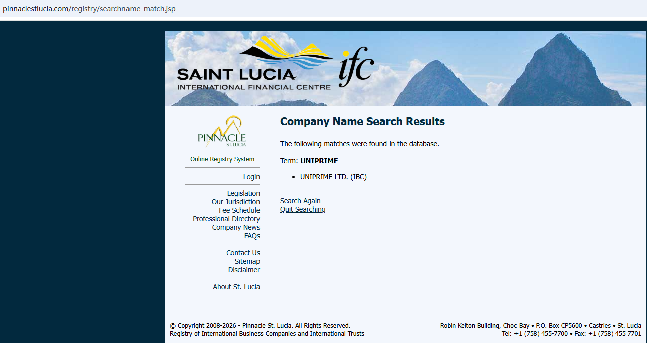 But we found that UNIPRIME LTD is registered with the International Financial Centre (IFC) in Saint Lucia, an International Business Companies Registry that doesn't license forex trading brokerage activities.
