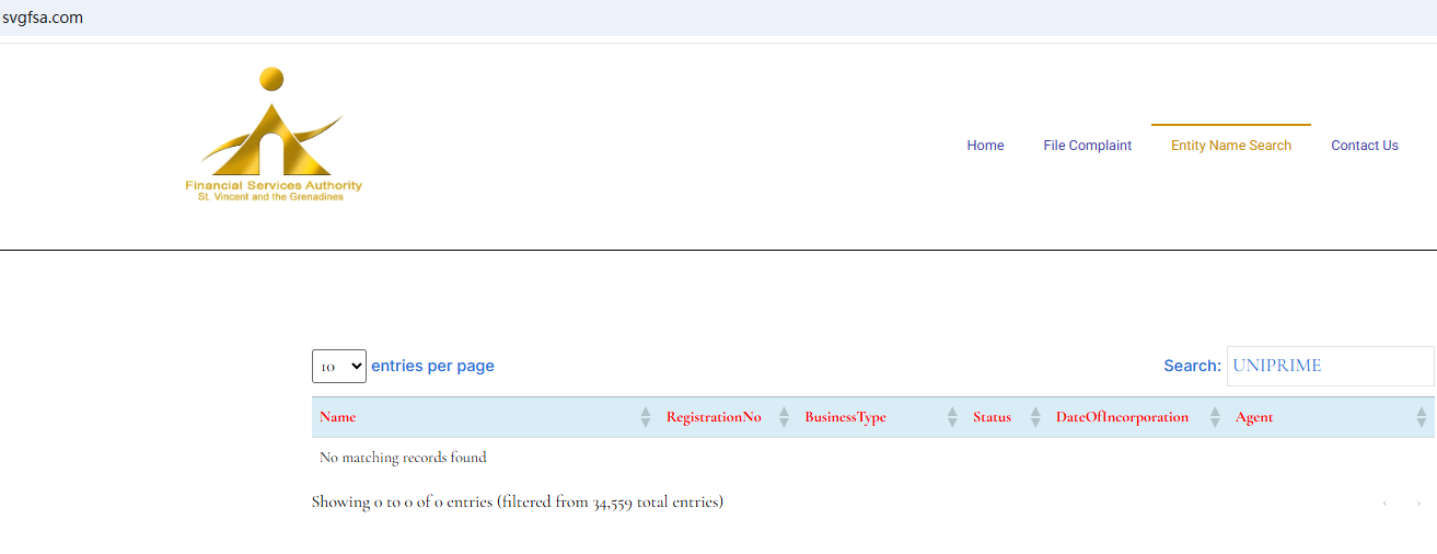 We didn't find the business registration of UNIPRIME with the Financial Services Authority in St. Vincent and the Grenadines(SVG FSA) , an offshore authority that doesn't license financial derivative trading brokerage activities.