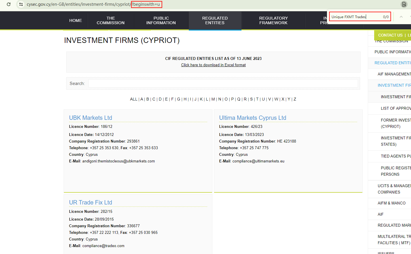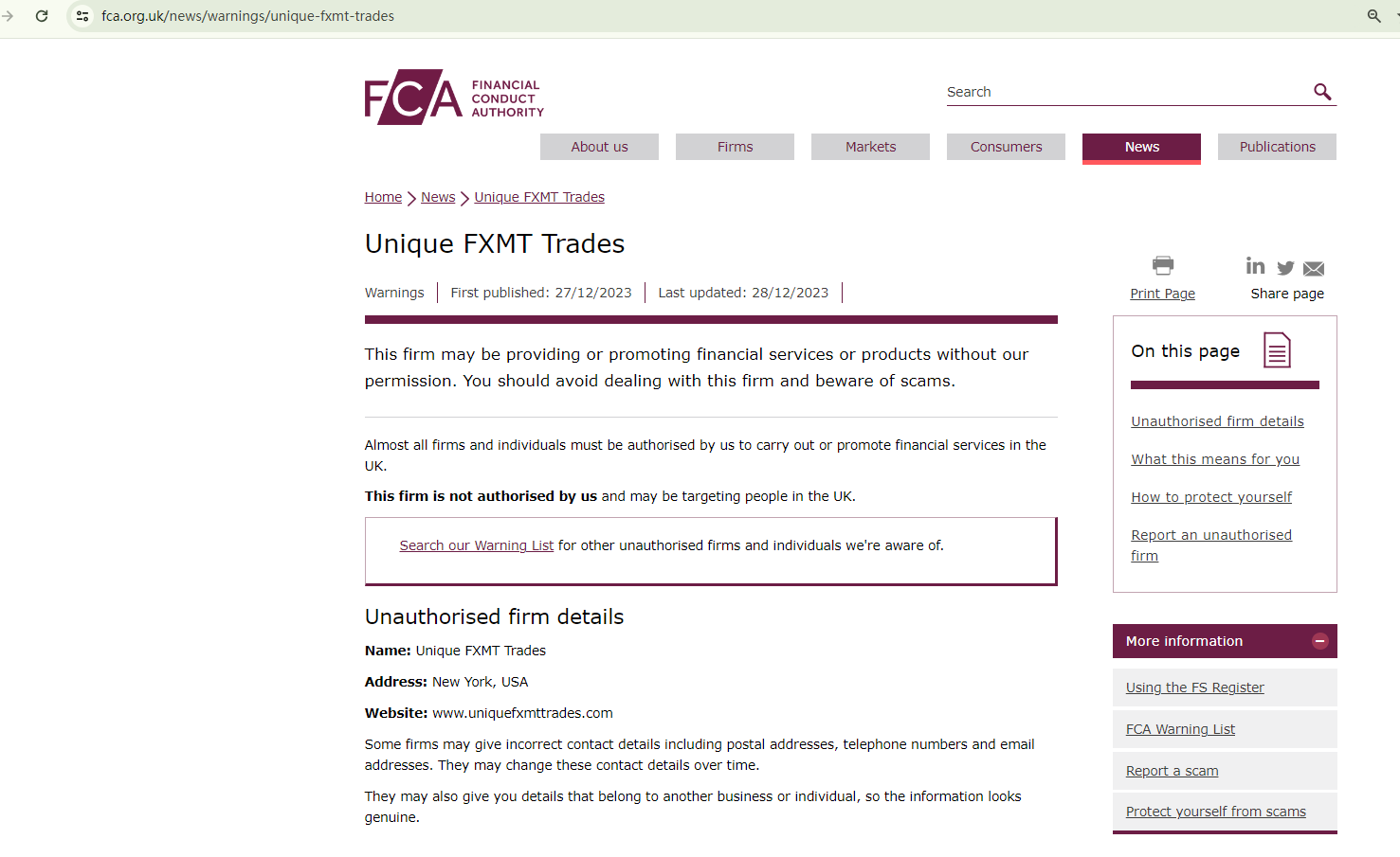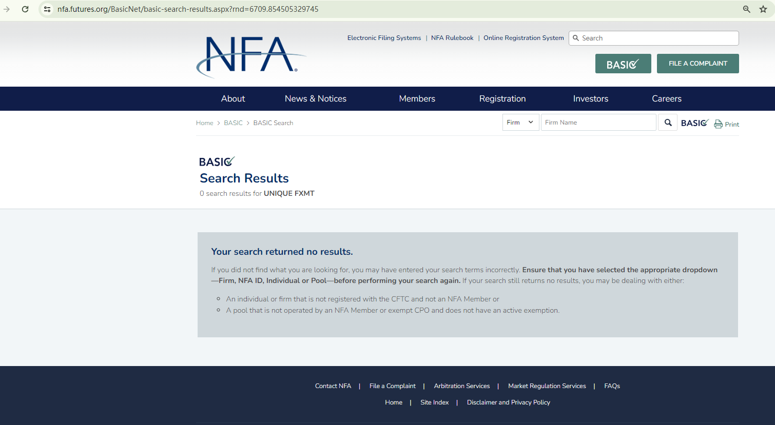 However, our investigation indicates that it is not a regulated entity. The FCA has flagged Unique FXMT Trades as an unauthorized firm in the UK, contradicting its claim of being regulated by them. Furthermore, no corresponding results were found in the CySEC register or the National Futures Association (NFA) database.