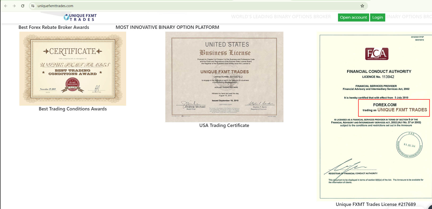 Adding to the concerns, Unique FXMT Trades falsely asserts on its fabricated FCA license that it is the trading name of Forex.com, a regulated forex broker. However, there are no official documents to support this assertion.