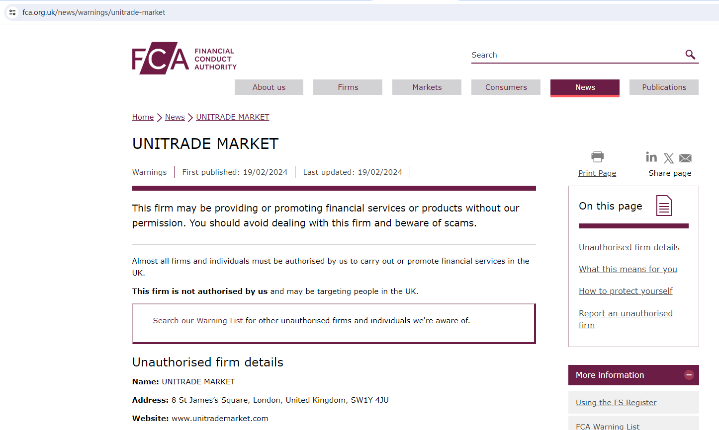 To operate as this type of broker in the UK, a company must be regulated by the United Kingdom Financial Conduct Authority (UK FCA), but UK FCA issued a warning that UNITRADE MARKET was providing finacial services or products without authorisation.