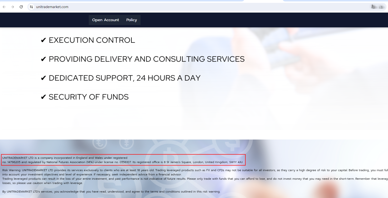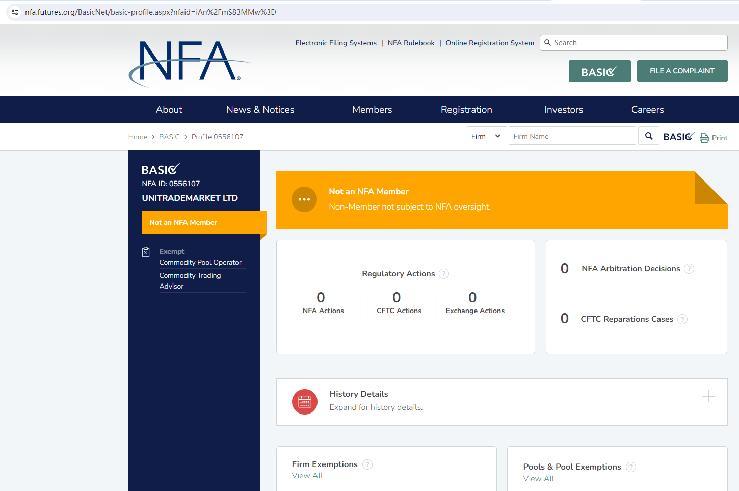 We searched the UK Company House and NFA and indeed found corresponding entires, but it is crucial to note that having registration with the CH does not mean being authorized to provide financial services, and UNITRADE MARKET is not an NFA member and thus not subject to the regulator's oversight. Its NFA ID is only for tracking purposes only.