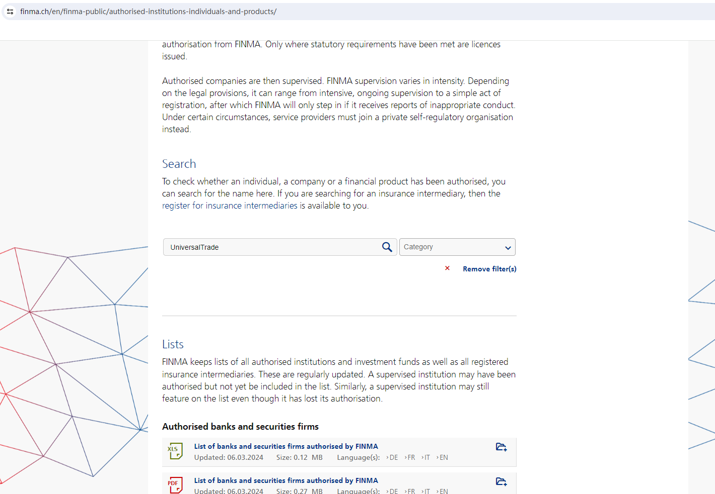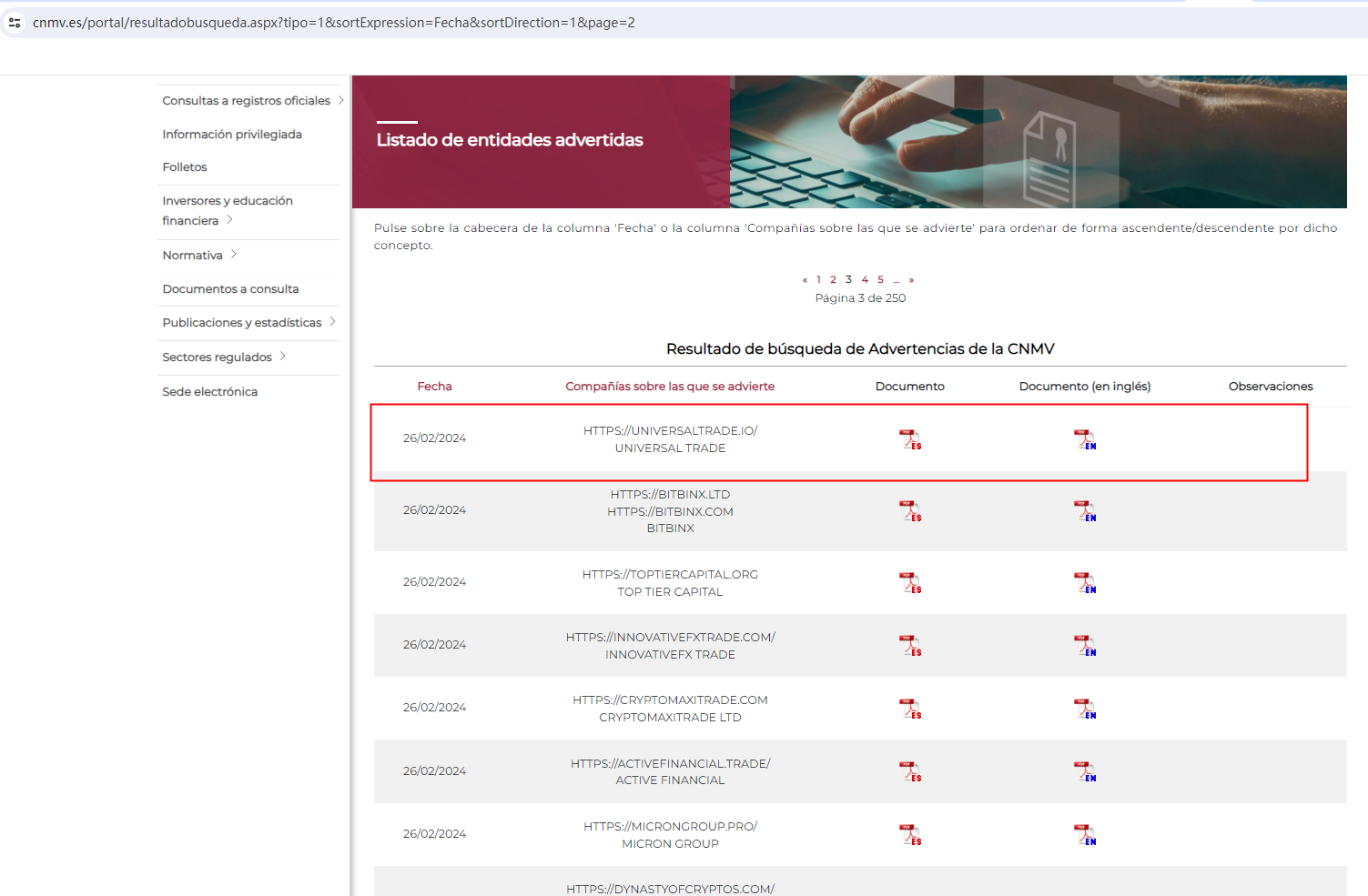 Furthermore, the Comisión Nacional del Mercado de Valores (CNMV) added UNIVERSAL TRADE to its warning list for providing investment services without authorization.