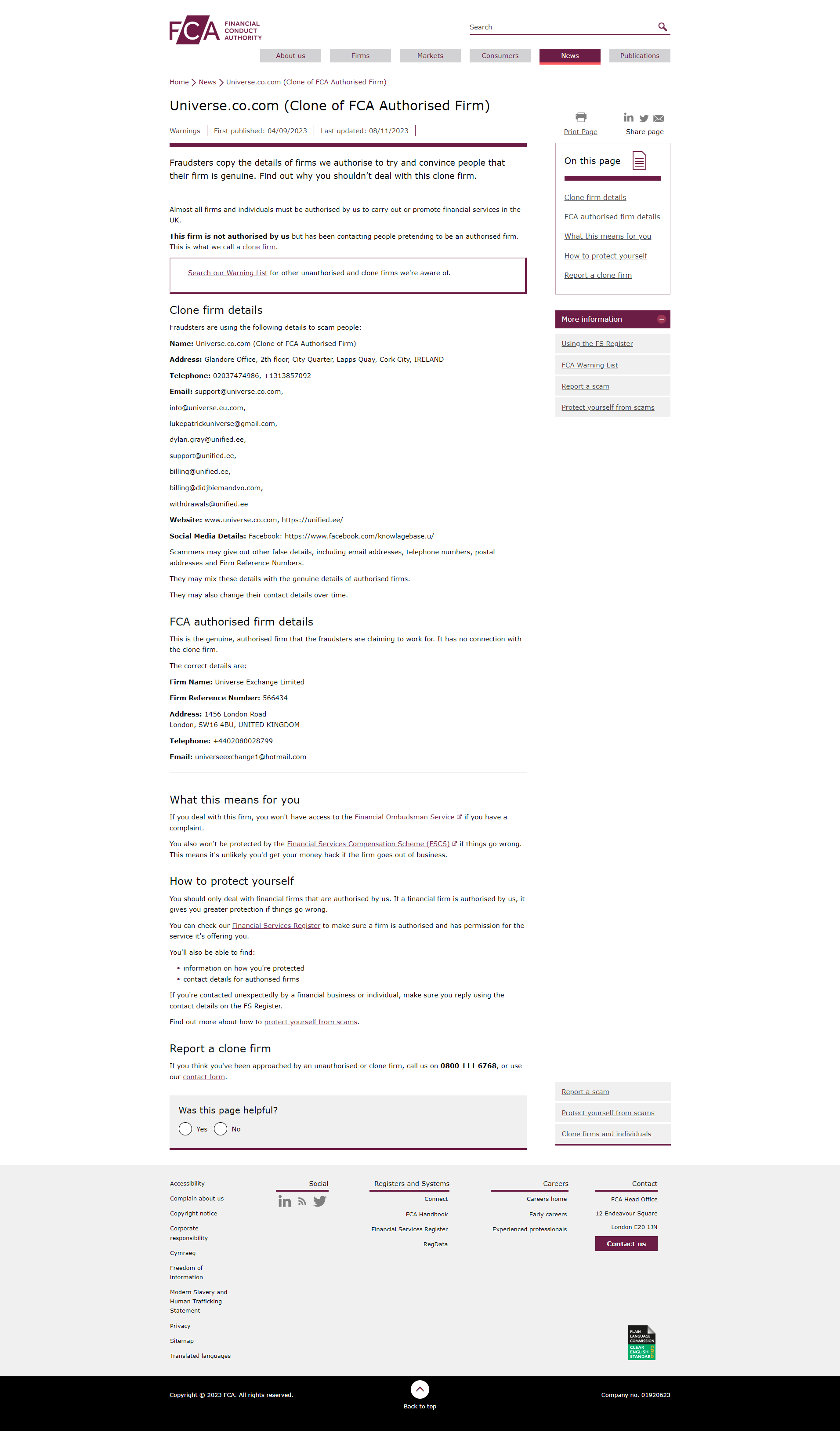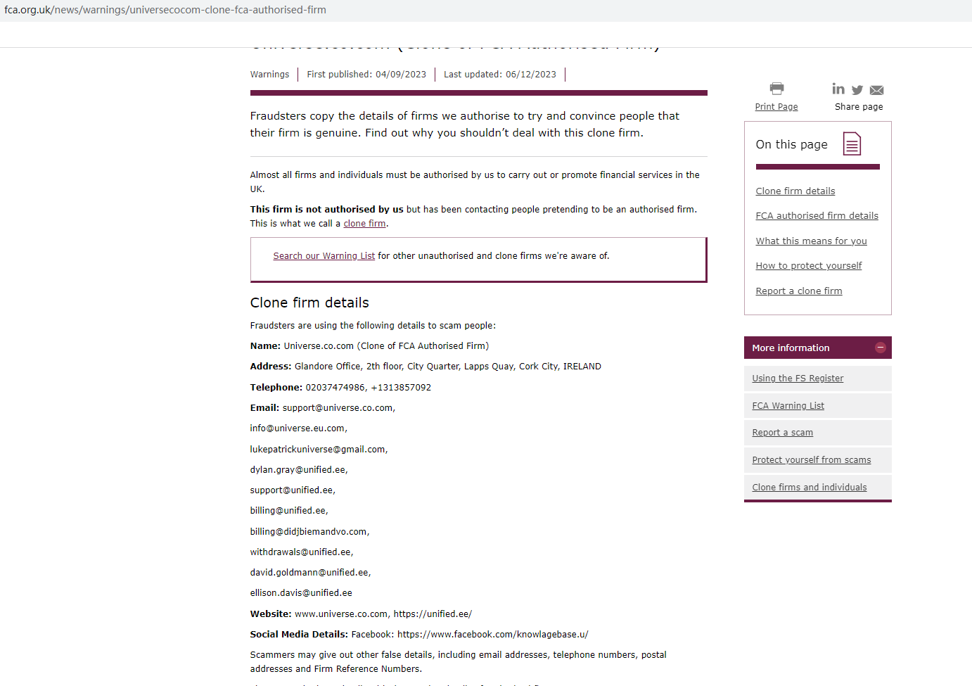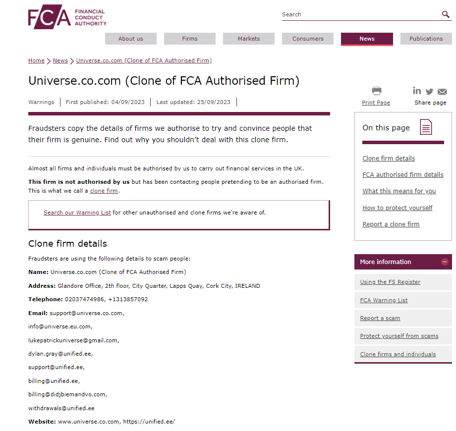 The United Kingdom Financial Conduct Authority (UK FCA) issued a warning that the Universe.co.com copy details of companies we authorize to try to make people believe their company is real, it is a clone.