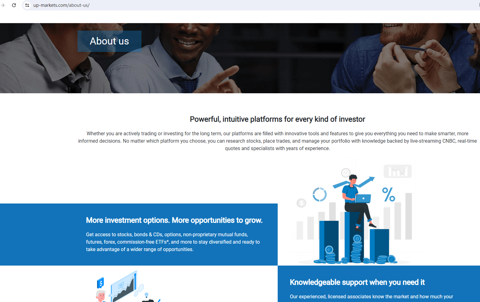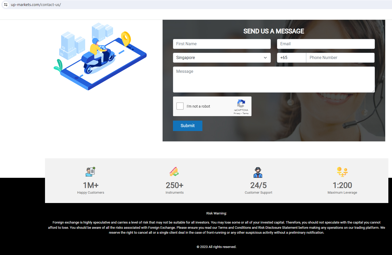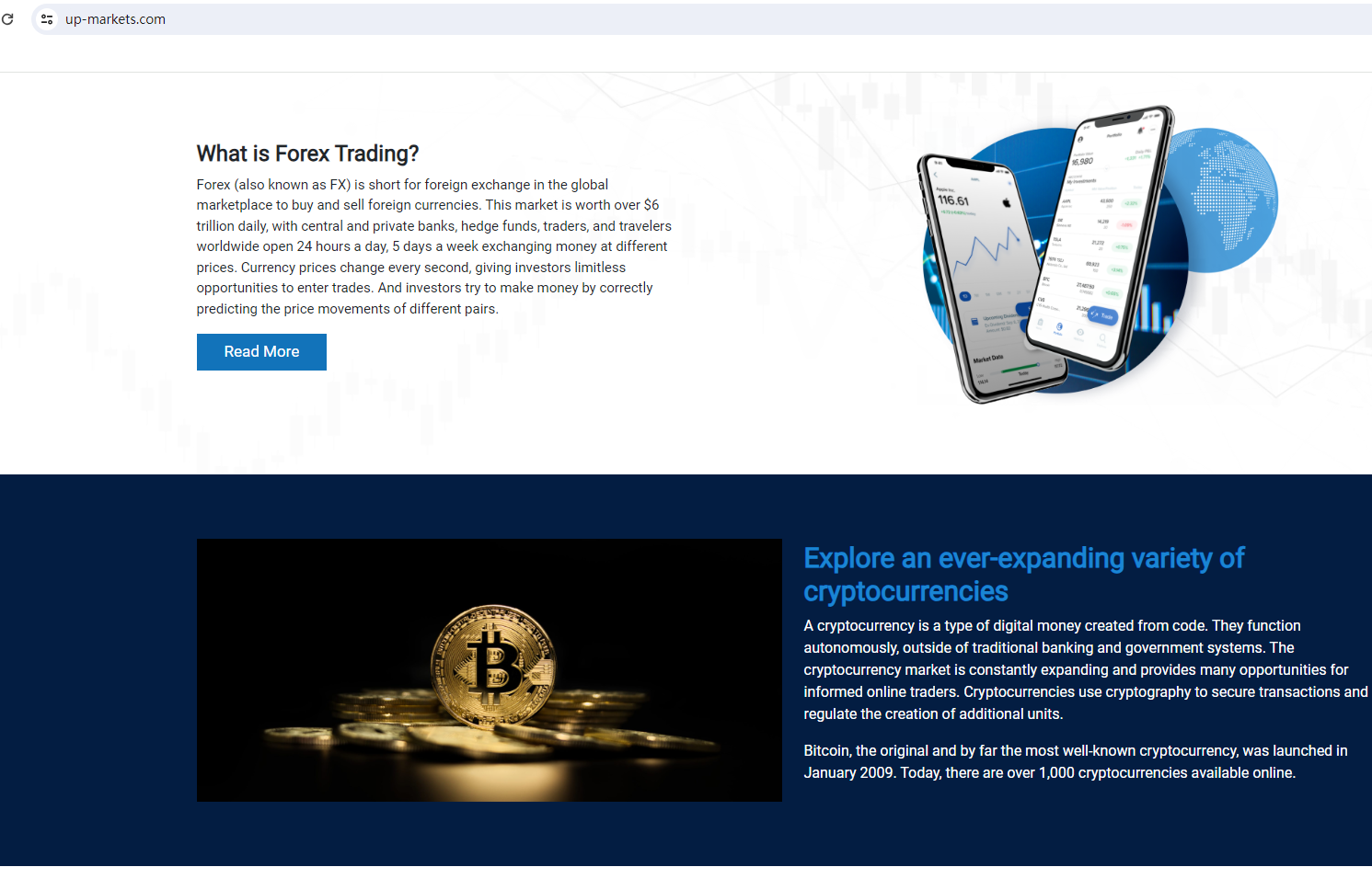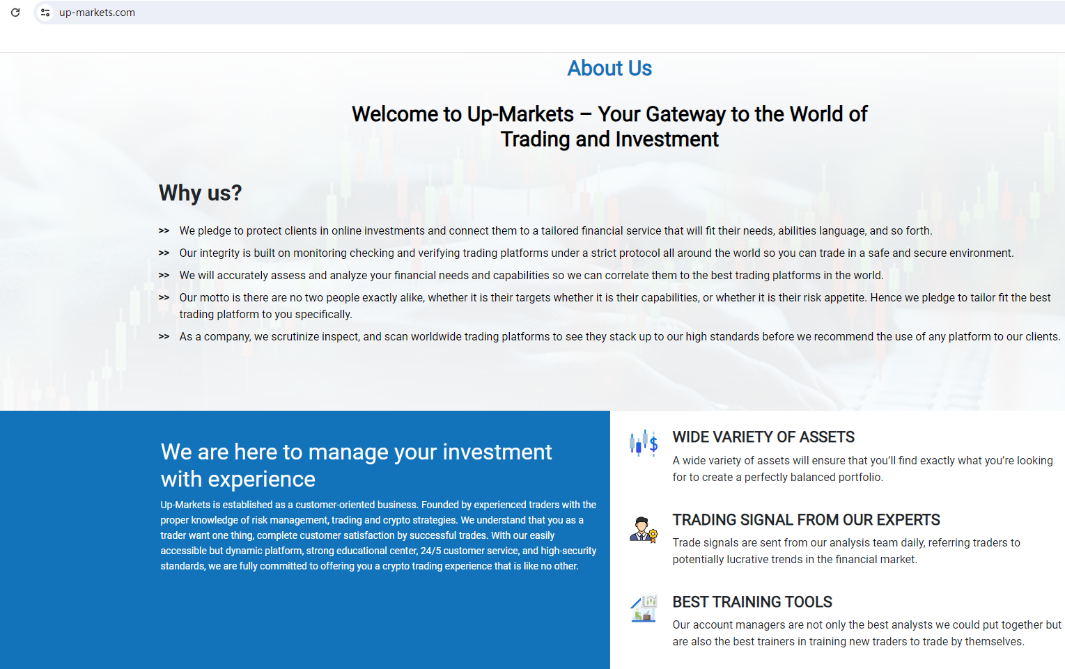 UP Markets claims to be a reliable company without presenting any information about its regulation or contact. The lack of such important information may be a distinct signal of an unlicensed broker, as regulated companies always present their accreditations and licenses in a prominent position. It is a red flag.