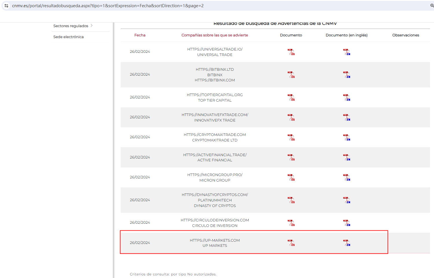 The Comisión Nacional del Mercado de Valores (CNMV) added UP Markets to its warning list for providing investment services without authorization.