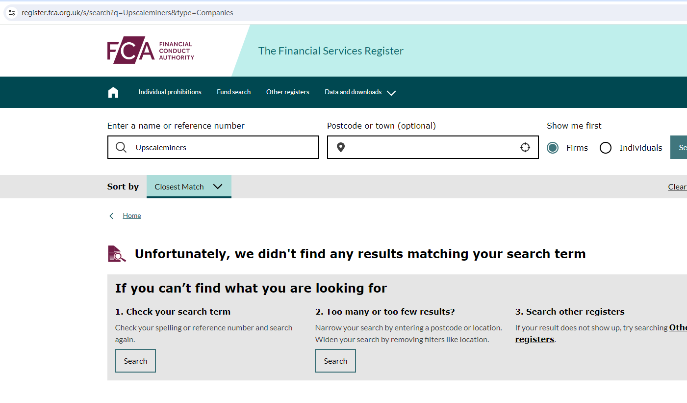 It is crucial to note that having registration with the CH does not mean being authorized to provide financial services. To operate as this type of broker in the UK, a company must be regulated by the United Kingdom Financial Conduct Authority (UK FCA), but our search for Upscaleminers in the FCA register didn't yield any results.