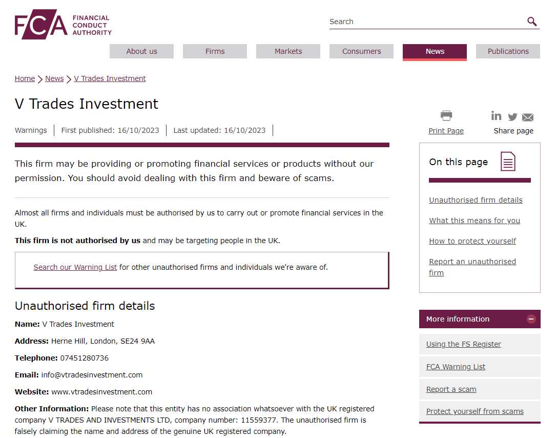In addition, it is located in UK. However, upon investigation, the United Kingdom Financial Conduct Authority (UK FCA) issued a warning that V Trades Investment was providing finacial services or products without authorisation.