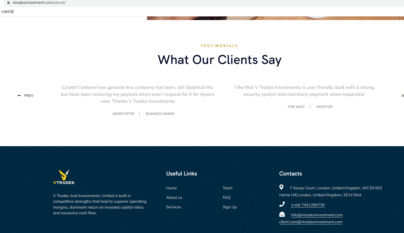 V Trades Investment claims to be a reliable company without presenting any information about its regulation or contact. The lack of such important information may be a distinct signal of an unlicensed broker, as regulated companies always present their accreditations and licenses in a prominent position. It is a red flag. In addition, it is located in UK. However, upon investigation, the United Kingdom Financial Conduct Authority (UK FCA) issued a warning that V Trades Investment was providing finacial services or products without authorisation.The truth is that V Trades Investment is not regulated by any regulators. Letting it hold or control investors' money is unsafe, and the money can not be protected by any laws.V Trades Investment is a scam.