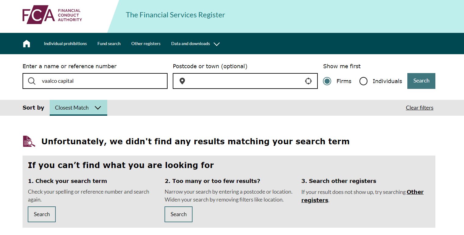 ANSWER Given its fraudulent nature, we strongly suggest you drop the plan to engage with vaalco capital.The first warning sign is its lie about its history. Vaalco capital claims that it has been in business for 3,150 days, equivalent to nearly nine years. However, its domain, vaalcocapital.cc, was first registered in July 2023.As per UK law, almost all businesses or individuals providing financial services or products in the UK are required to obtain authorization from the Financial Conduct Authority (FCA) before they can solicit investors. While vaalco capital alleges to have an office in this country, our search for the company in the registry of the FCA didn't yield any results. This means it doesn't comply with the rules and regulations and thus its offerings are illegal.Therefore, it is risky to deal with vaalco capital. This unregulated broker presents potential dangers of fraud and identity theft. Individuals dealing with this unlicensed platform are not protected by the regulatory framework. To minimize these risks, we strongly suggest staying away from unlicensed brokers like vaalco capital and instead choosing fully regulated ones.