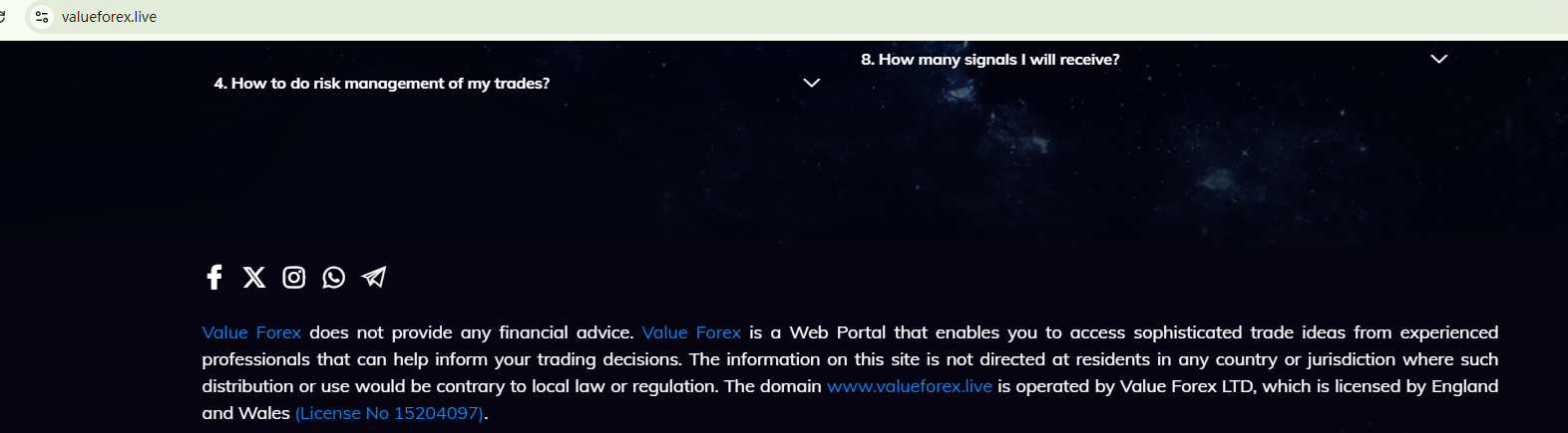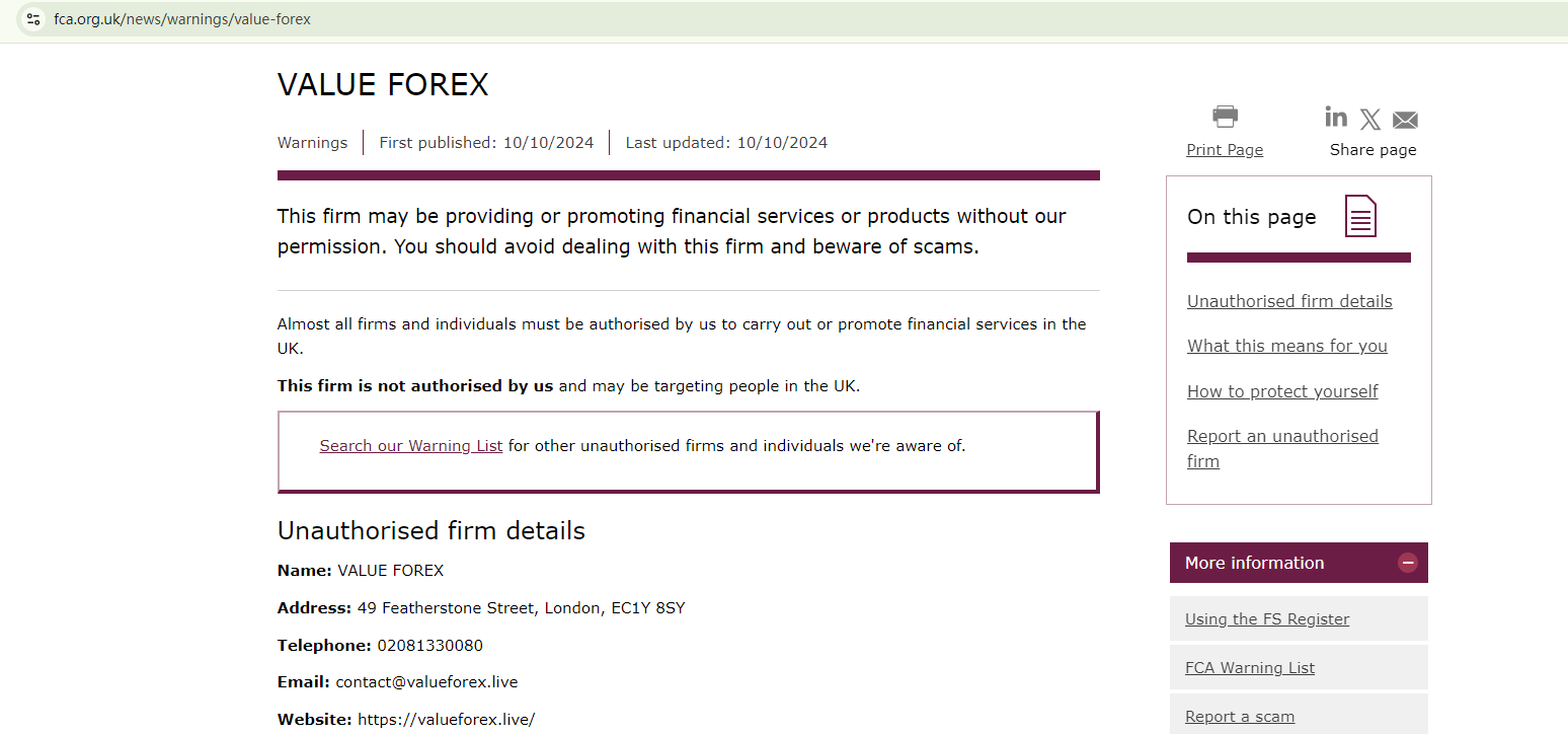 VALUE FOREX claims to be operated by VALUE FOREX LTD, supposedly under company number 15204097 in the UK. However, information from the Companies House (CH) suggests that this company number is linked to a different entity that seems to have no association with VALUE FOREX. In addition, the Financial Conduct Authority (FCA) has flagged VALUE FOREX for providing financial services or products in the UK without authorization.