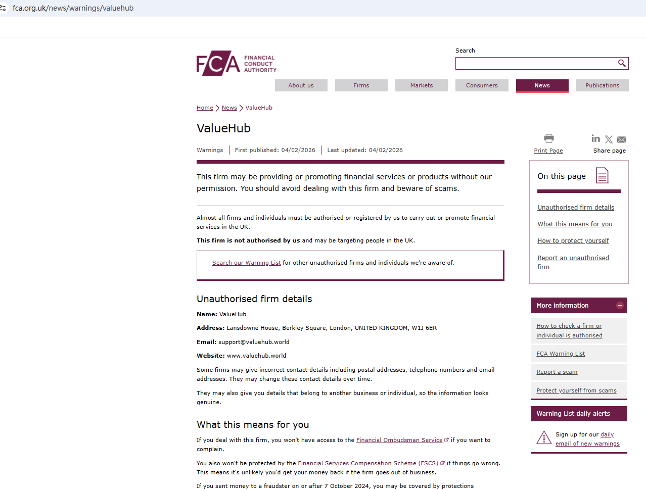 On Feb 4, 2026, the Financial Conduct Authority (FCA) issued a warning regarding ValueHub, suspecting that this company may be offering financial services or products without the necessary authorization. https://www.fca.org.uk/news/warnings/valuehub