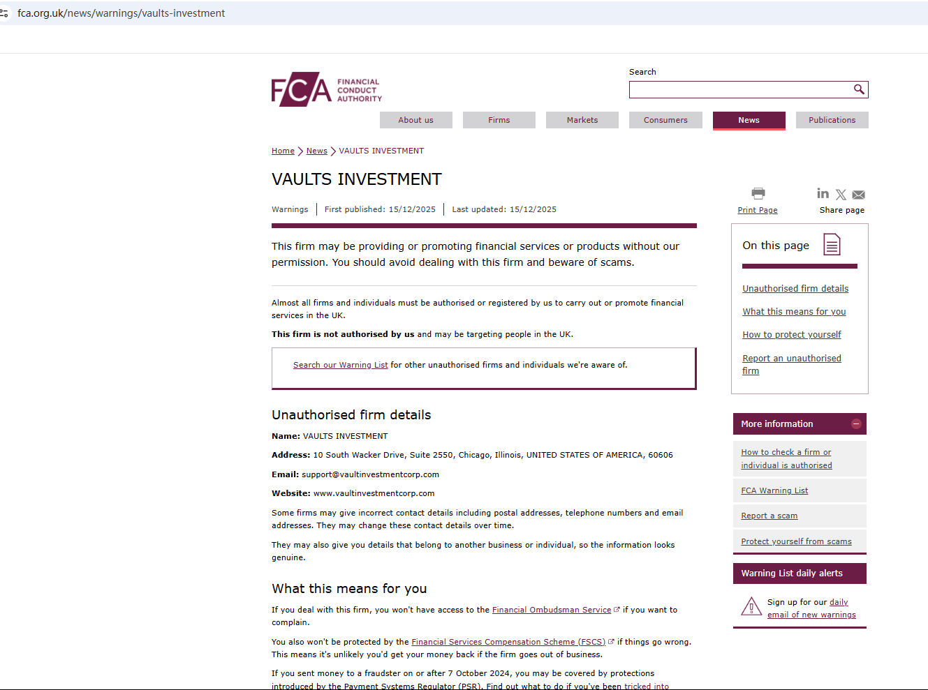 On Dec 15, 2025, the Financial Conduct Authority (FCA) issued a warning regarding VAULTS INVESTMENT, suspecting that this company may be offering financial services or products without the necessary authorization. https://www.fca.org.uk/news/warnings/vaults-investment