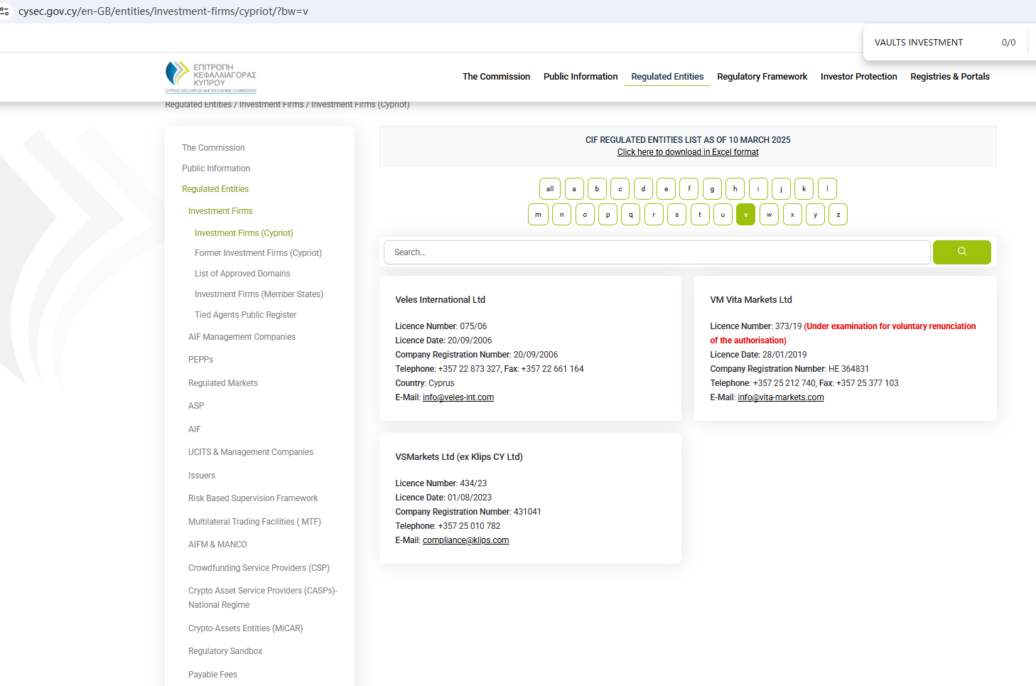 According to its website, it is regulated by both the Financial Conduct Authority (FCA) and the Cyprus Securities and Exchange Commission (CySEC). However, a search revealed no matching information with CySEC. Furthermore, the FCA issued a warning regarding VAULTS INVESTMENT, suspecting that this company may be offering financial services or products without the necessary authorization.