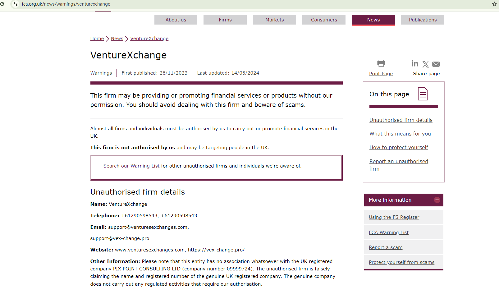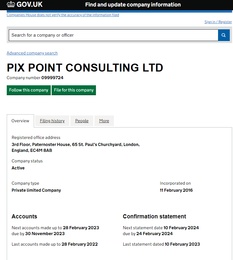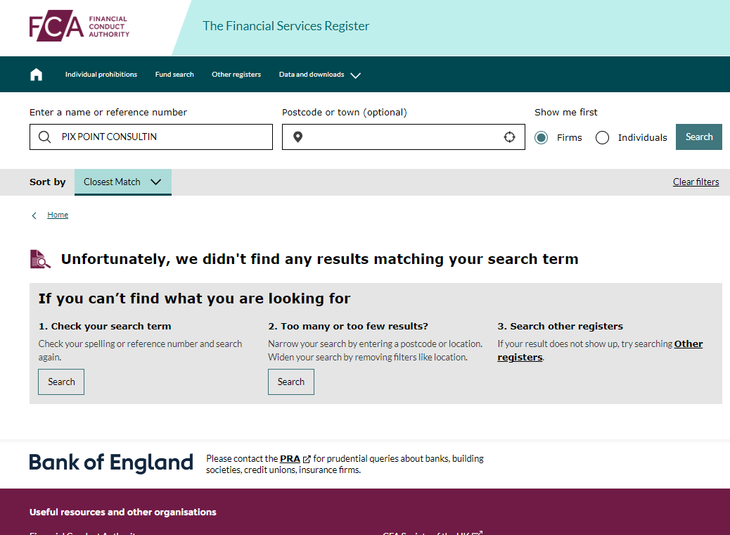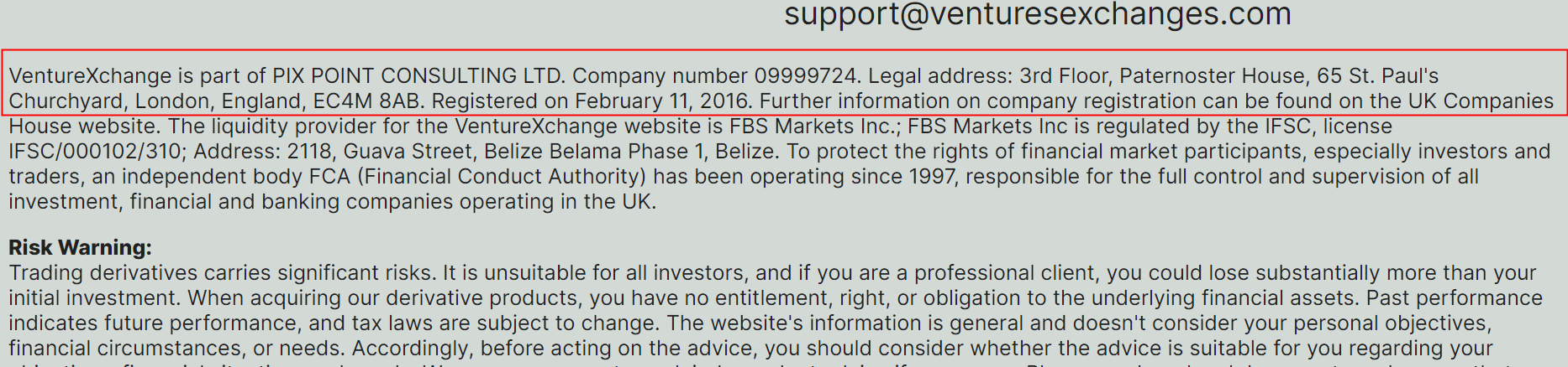 According to its website, it claims VentureXchange is part of PIX POINT CONSULTING LTD. Company number 09999724. Upon investigation, we did find relevant information in the companies house, but this cannot be used as evidence of regulation. In addition, we searched on Financial Conduct Authority (FCA), but did not find any information about VentureXchange.