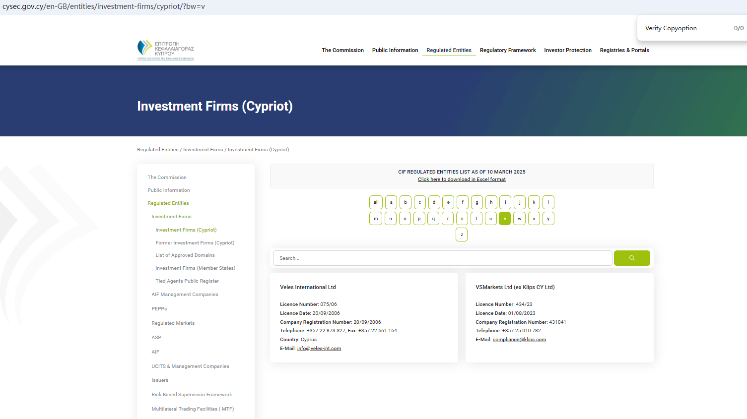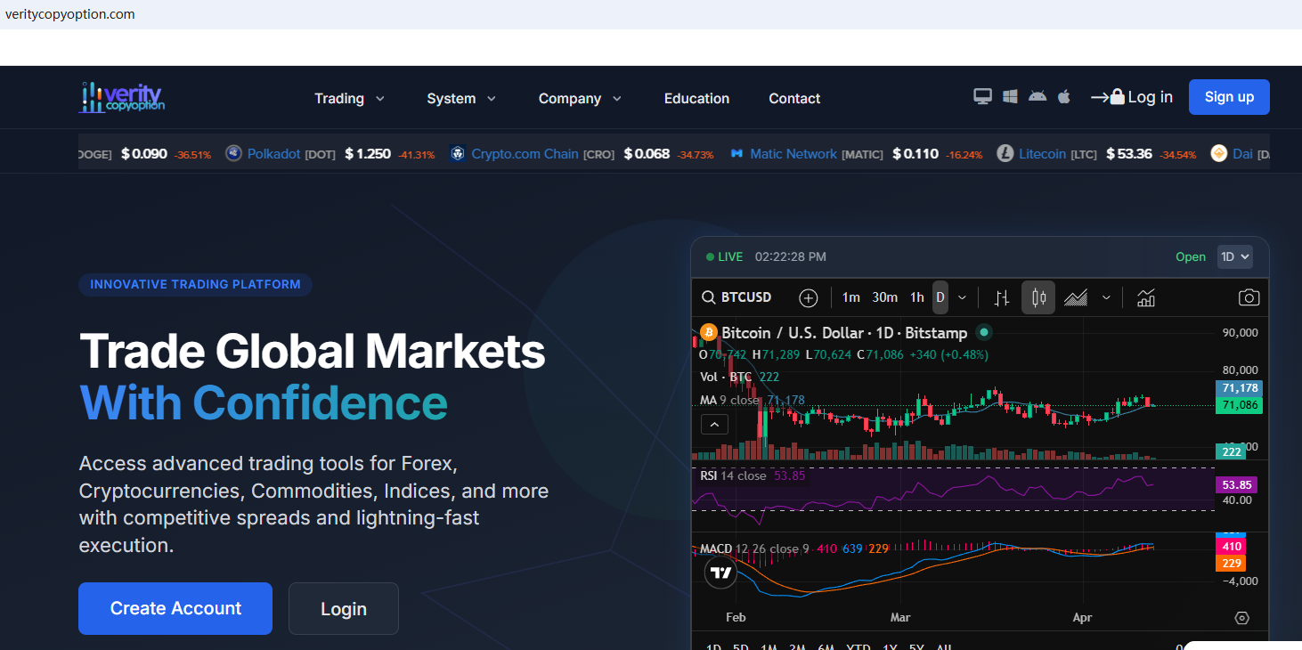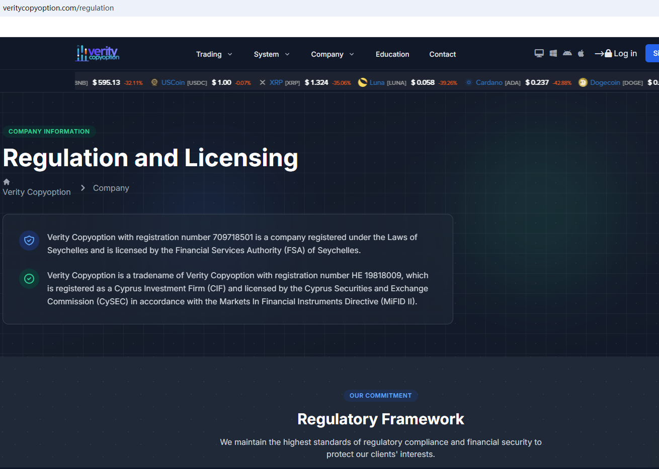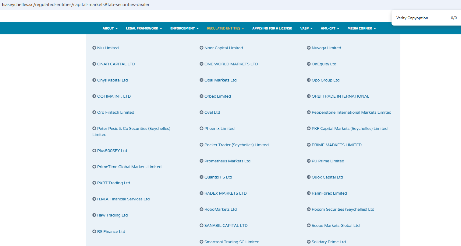 According to its website, it claims to be regulated by the Seychelles Financial Services Authority (Seychelles FSA) and the Cyprus Securities and Exchange Commission (CySEC). Upon investigation, no matching information was found in the Seychelles FSA and CySEC. In addition, the Financial Conduct Authority (FCA) issued a warning regarding Verity Copyoption, suspecting that this company may be offering financial services or products without the necessary authorization.