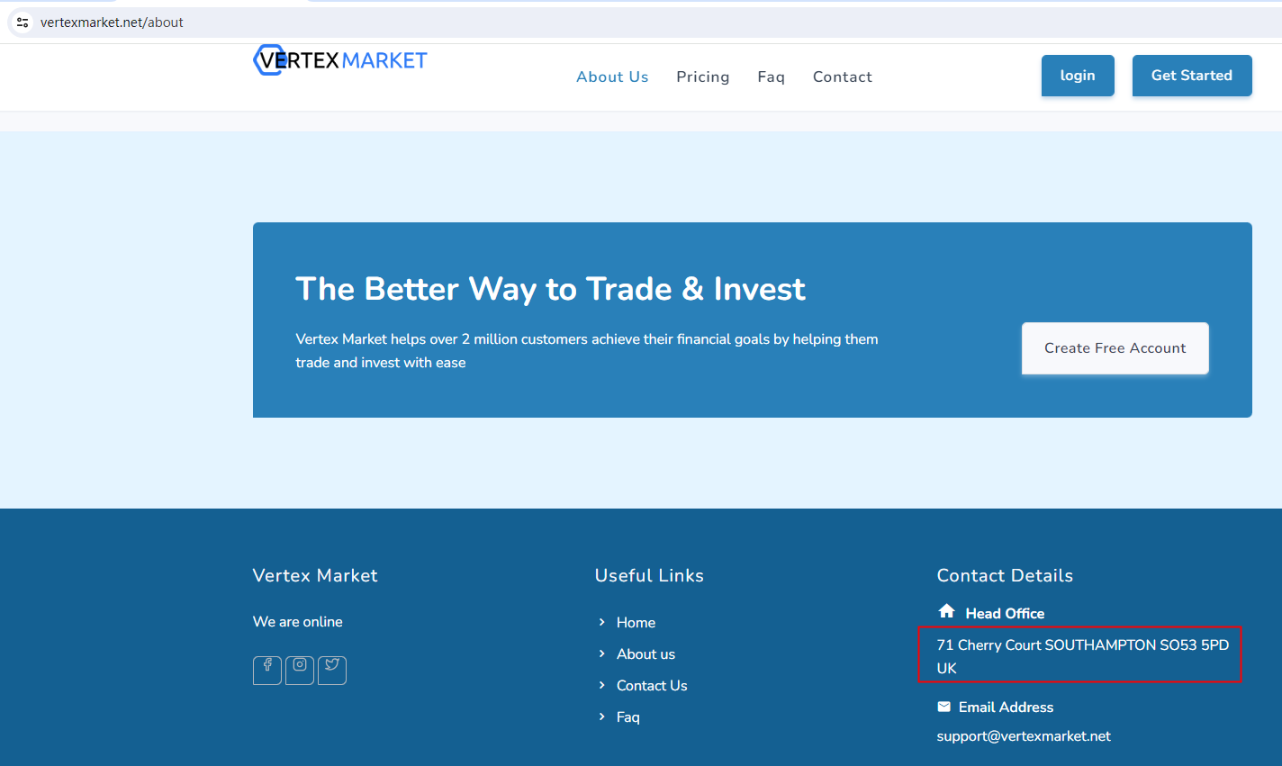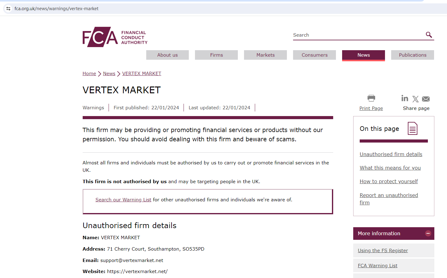 Vertex Market locates in the United Kingdom, but the United Kingdom Financial Conduct Authority (UK FCA) issued a warning that Vertex Market was providing finacial services or products without authorisation.