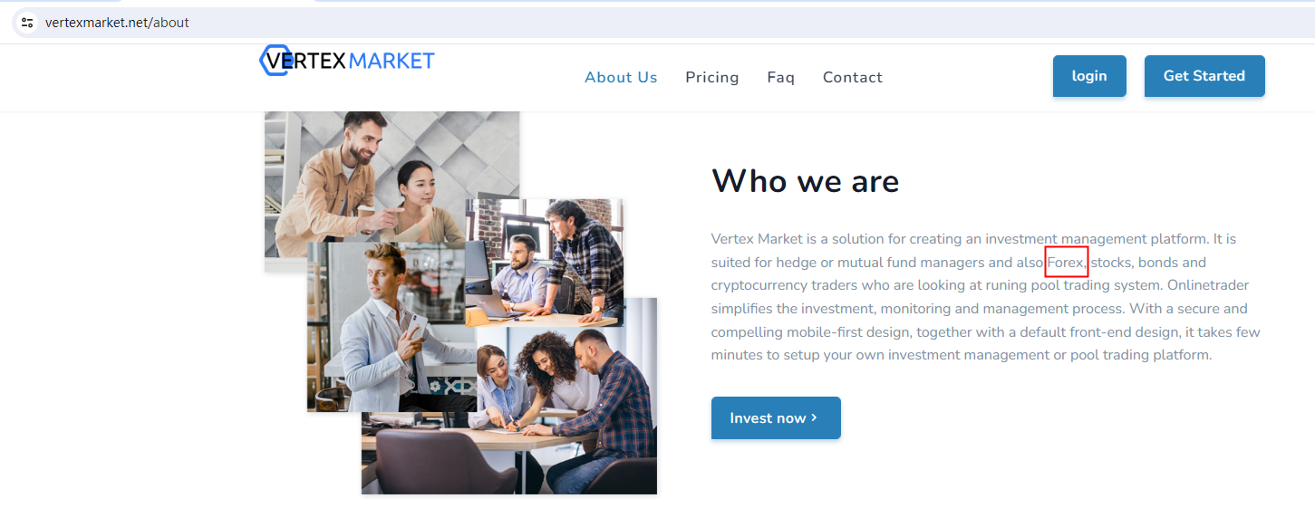 Vertex Market claims to be a reliable company without presenting any information about its regulation.Vertex Market locates in the United Kingdom, but the United Kingdom Financial Conduct Authority (UK FCA) issued a warning that Vertex Market was providing finacial services or products without authorisation.The truth is that Vertex Market is not regulated by any regulators. Letting it hold or control investors' money is unsafe, and the money can not be protected by any laws.Vertex Market is a scam.