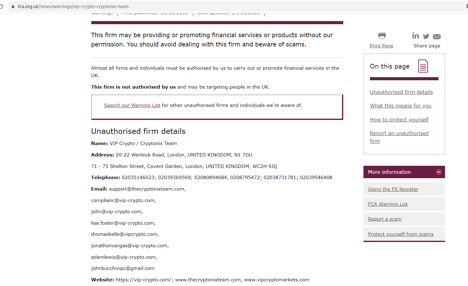 On 24 November 2023, the United Kingdom Financial Conduct Authority (UK FCA) issued a warning that Vip Crypto was providing financial services or products in the UK without authorisation. You may visit: https://www.fca.org.uk/news/warnings/vip-crypto-cryptonix-team