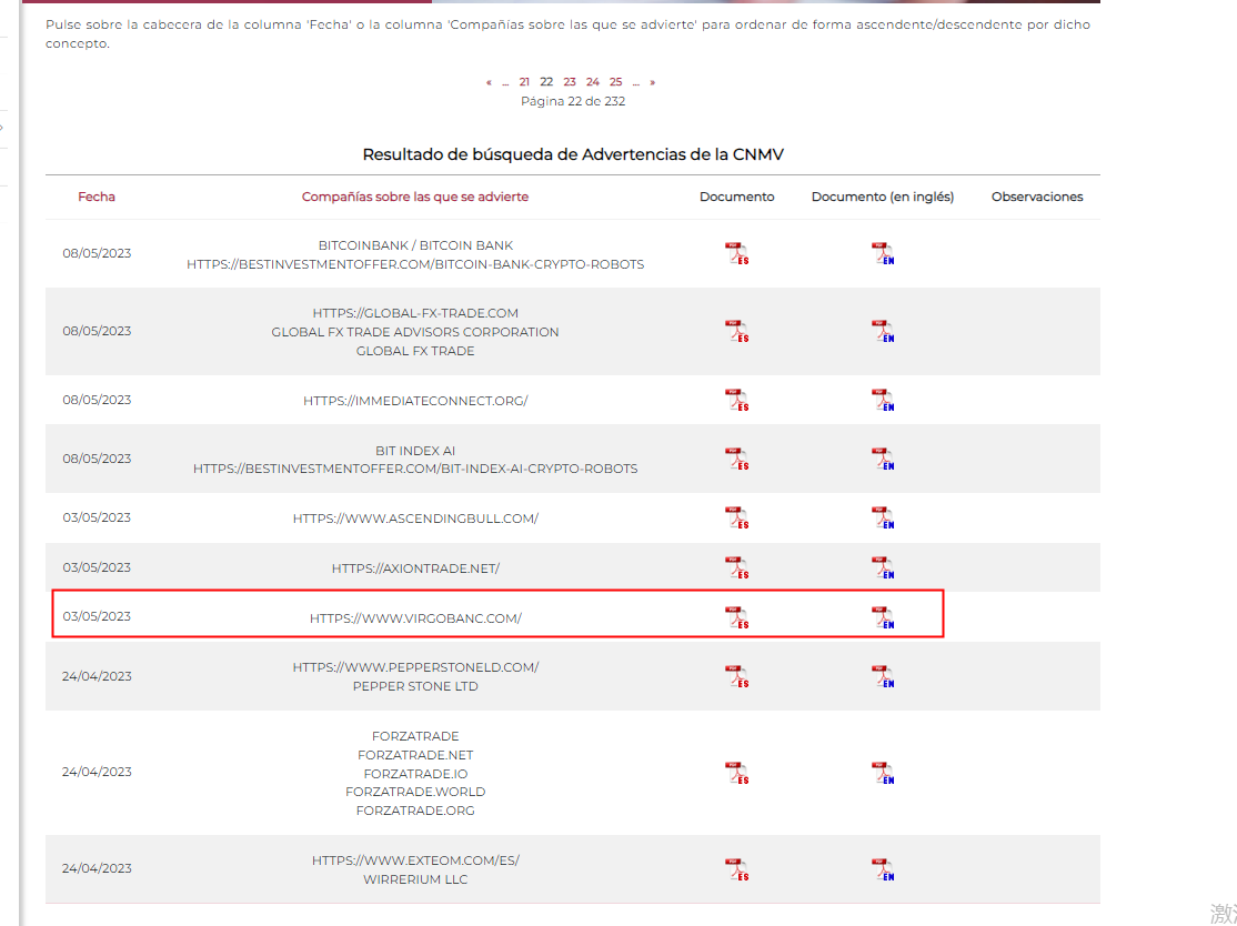 In addition, the Comisión Nacional del Mercado de Valores (CNMV) has added VIRGOBANC to its warning list for it providing investment services without authorization.