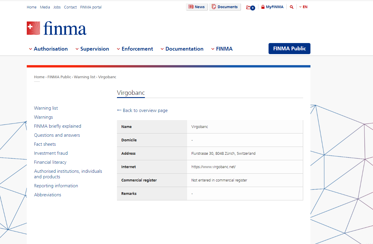 VIRGOBANC claims to be an established broker while it doesn't provide any details about its regulatory status, which is a clear indication of an unlicensed broker, as legitimate ones typically prominently display their accreditation and licenses. Given it claiming to be located in Switzerland, we searched for this broker in the Swiss Financial Market Supervisory Authority (FINMA) registry, but no record matching it was found.