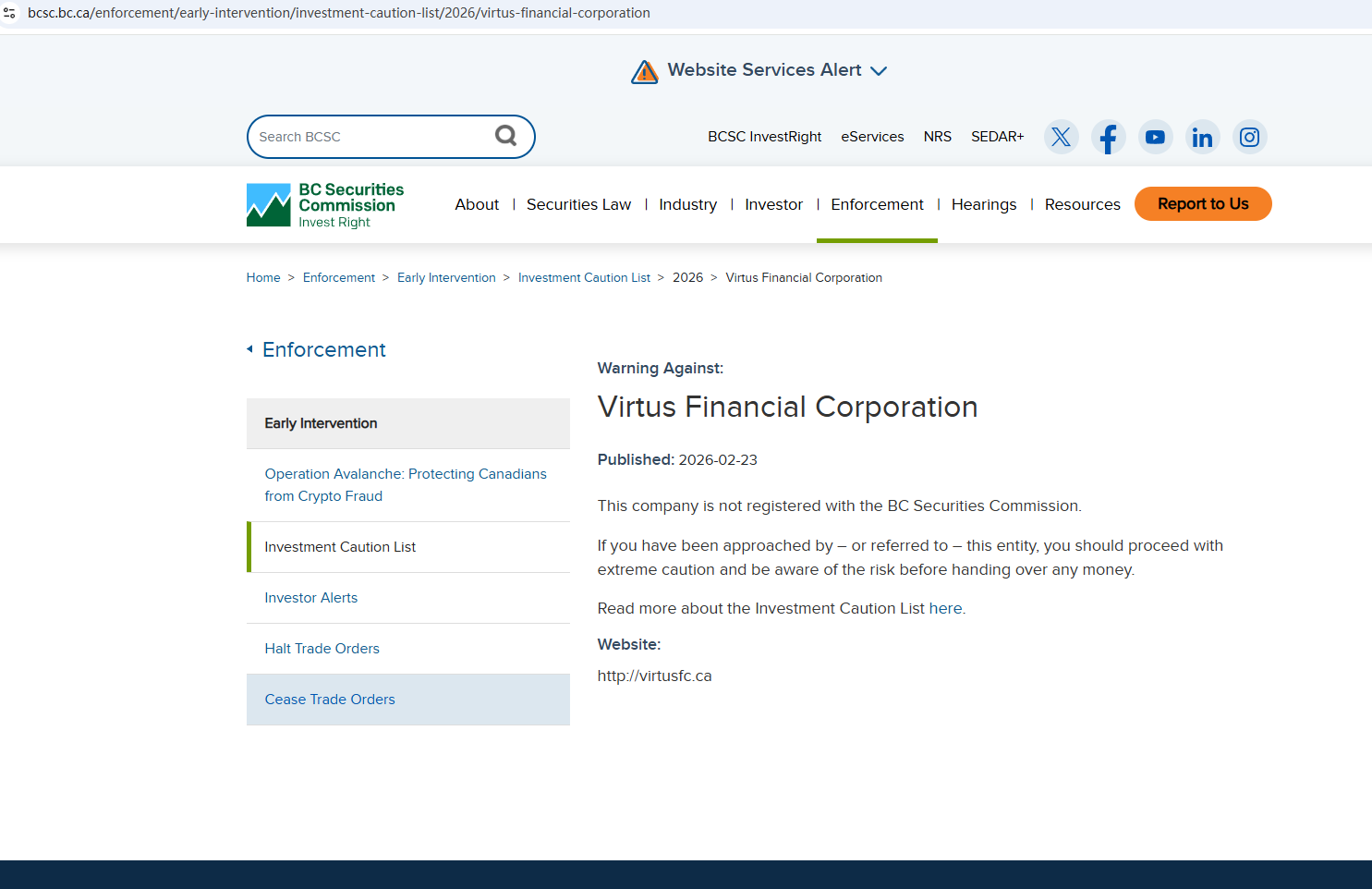 On Feb 23, 2026, the British Columbia Securities Commission (BCSC) issued a warning against Clone Virtus Financial Corporation, stating that this broker is not registered to trade in, or advise on, securities or derivatives in BC. https://www.bcsc.bc.ca/enforcement/early-intervention/investment-caution-list/2026/virtus-financial-corporation