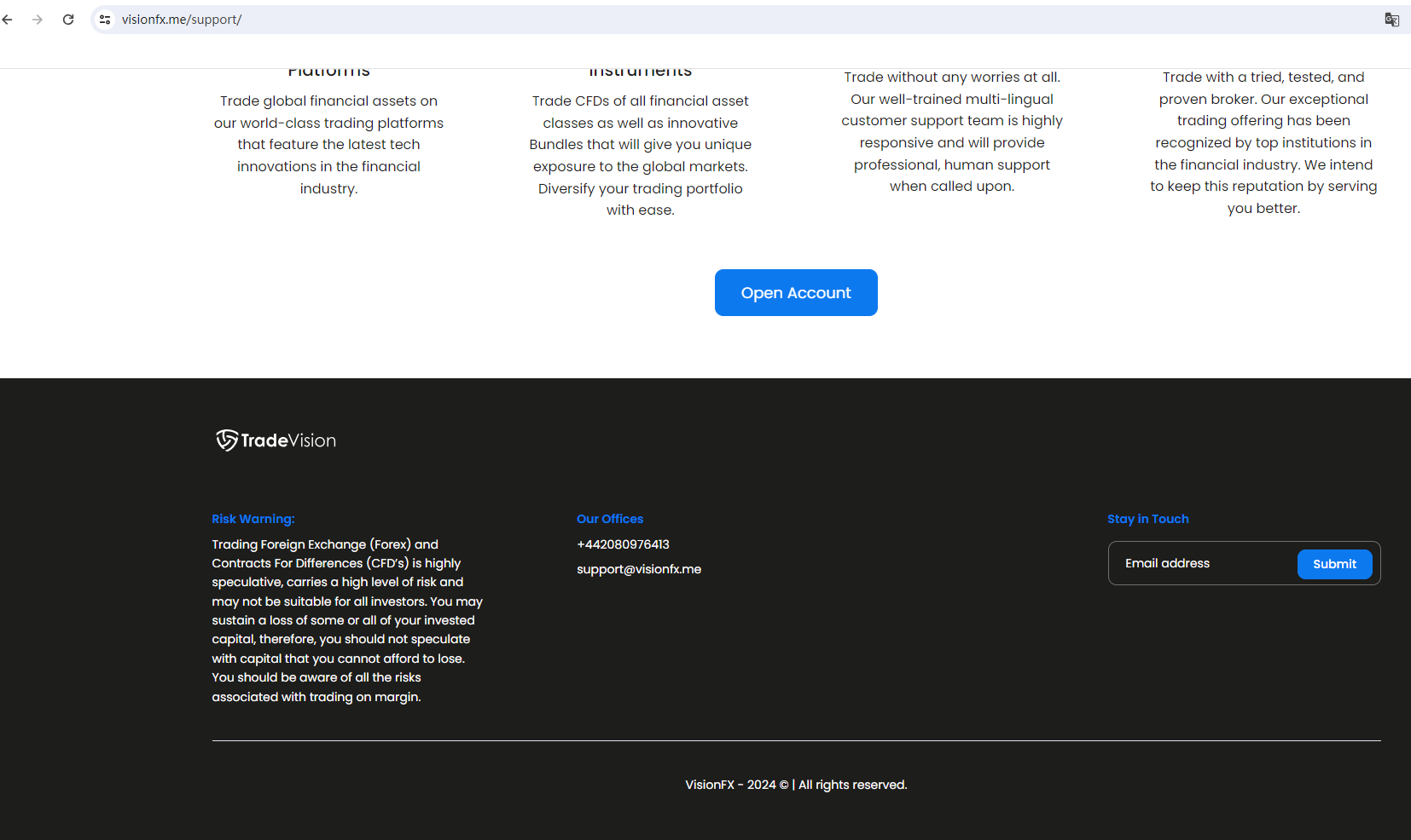 According to the phone number area code +44 on its website, this is the UK area code. Upon investigation, no matching information was found in the Financial Conduct Authority (FCA).In addition, the Ontario Securities Commission (OSC) issued a warning that VisionFX aka TradeVision was providing financial services or products without authorisation.The truth is that VisionFX aka TradeVision is not regulated by any regulators. Letting it hold or control investors' money is unsafe, and the money can not be protected by any laws.VisionFX aka TradeVision is a scam.