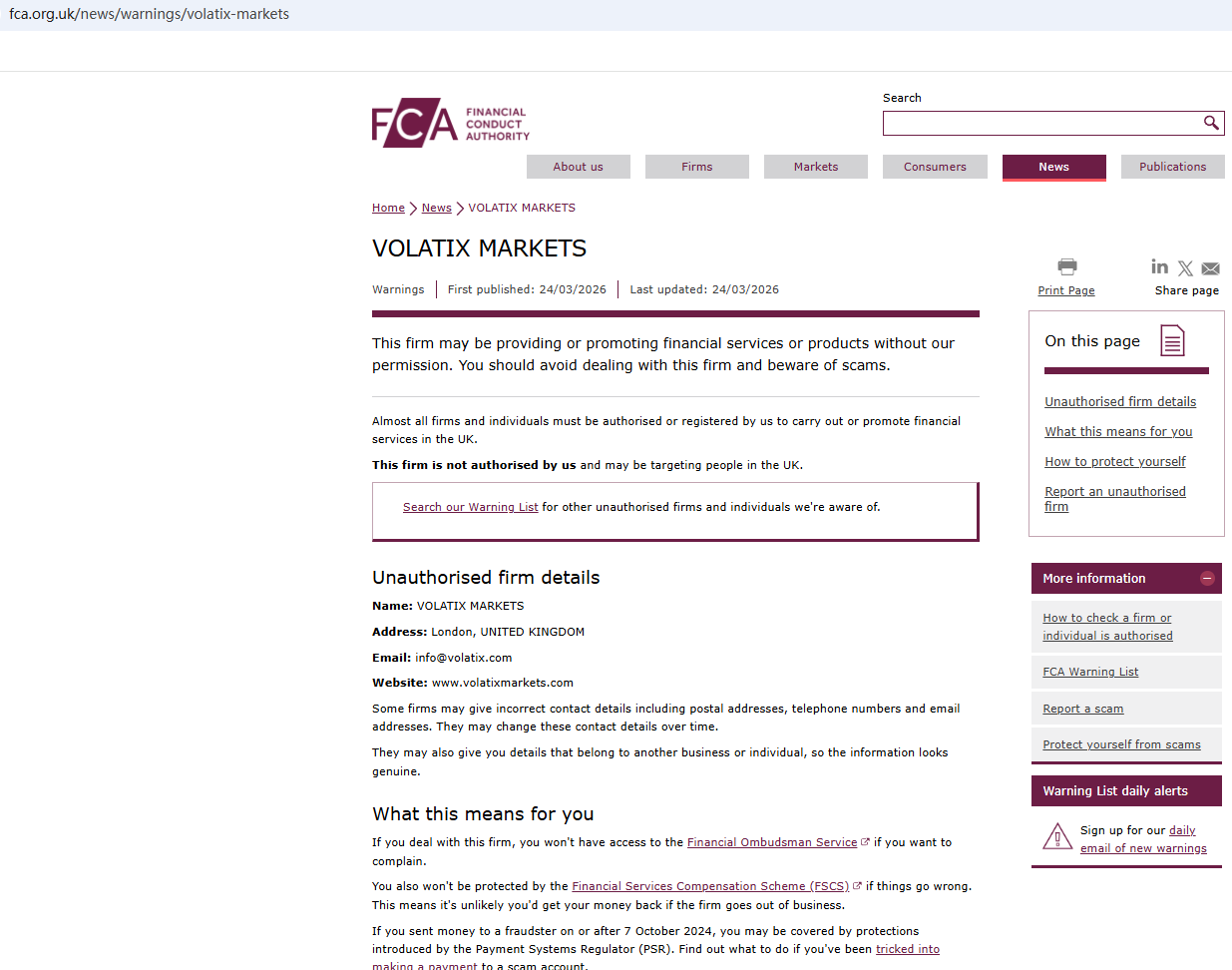On Mar 24, 2026, the Financial Conduct Authority (FCA) issued a warning regarding Volatix Markets, suspecting that this company may be offering financial services or products without the necessary authorization. https://www.fca.org.uk/news/warnings/volatix-markets