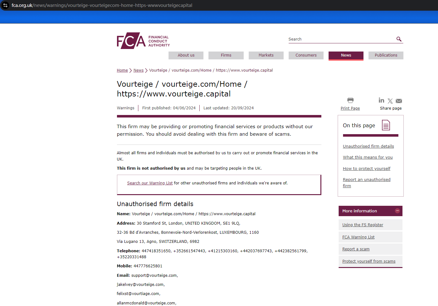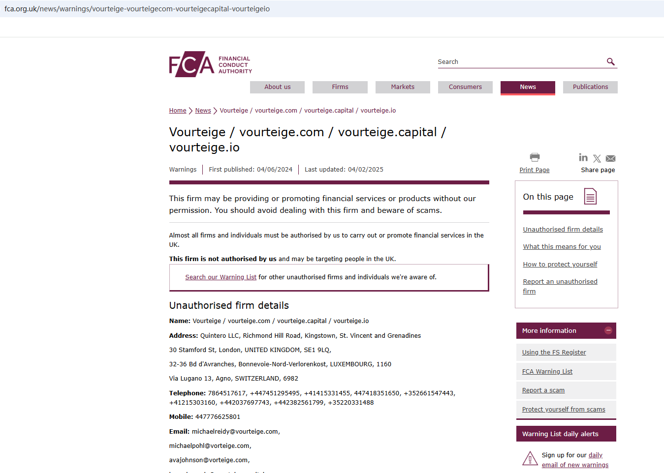 Vourteige claims to be owned and operated by Quintero LLC, and has the registration with the Financial Services Authority in St. Vincent and the Grenadines(SVG FSA), the company registration number: 3314 LLC 2023, offering wide range of financial services, including Forex, Cryptocurrencies, and more instruments in global markets.Upon investigation, we found that Quintero LLC has the registration with SVG FSA, an offshore authority that doesn't license forex trading brokerage activities.And the Financial Services and Markets Authority (FSMA) issued a warning againstVourteige (https://www.vourteige.com), believing this company might be providing financial services or products without authorisation in Belgium.The truth is that Vourteige is not regulated by any regulators. Letting it hold or control investors' money is unsafe, and the money can not be protected by any laws.Vourteige is a scam.