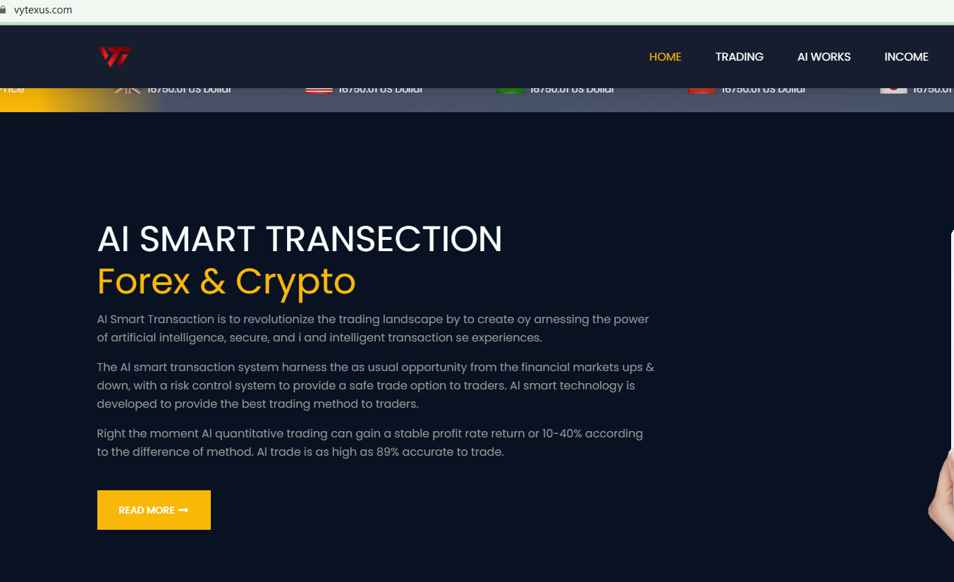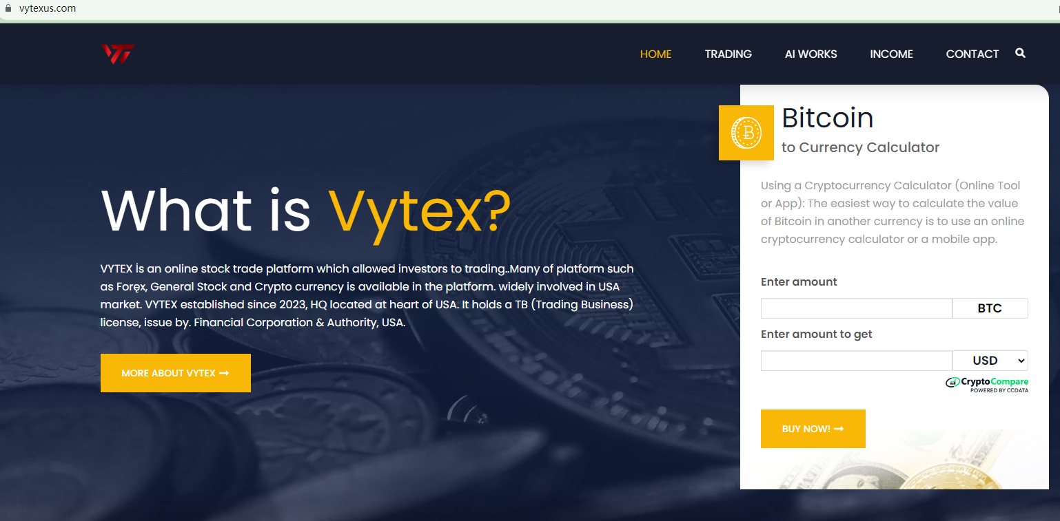 Vytex claims to be a forex broker headquartered in the US with a so-called license issued by the "Financial Corporation & Authority". However, there is no such agency in the US. As per US law, forex brokers are required to be regulated by the Commodity Futures Trading Commission (CFTC) and the National Futures Association (NFA), and therefore they need to be registered as an NFA-member. However, our search for this company in the NFA registry didn't yield any results. This means it operates outside of the regulatory framework.In essence, Vytex is not regulated by any governing body. Entrusting this broker with investors' funds is highly risky, as there are no legal protections in place to safeguard the funds.Vytex is unequivocally a scam.