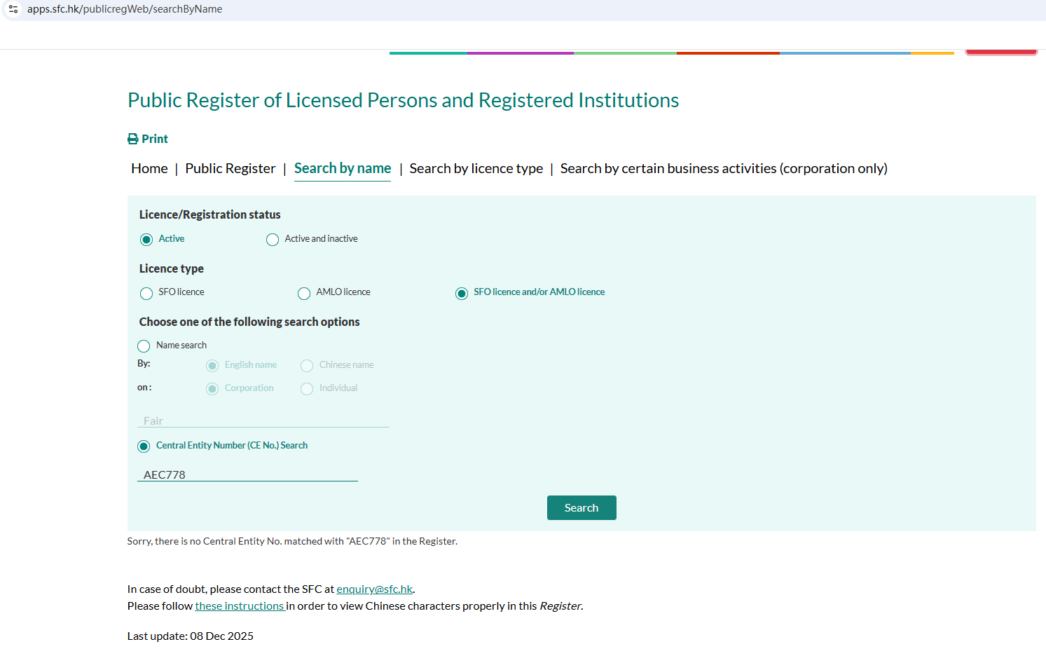 On Dec 8, 2025, the Securities and Futures Commission(SFC) issued a warning against WAI FAT SECURITIES, believing this company might be providing financial services or products without proper authorization in the HK. https://www.sfc.hk/TC/alert-list/3206