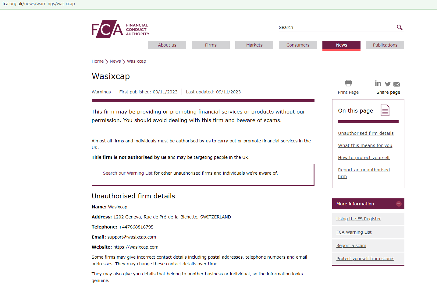 In addition, the British Columbia Securities Commission (BCSC) has issued a warning against Wasixcap, stating that this broker is not registered to trade in, or advise on, securities or derivatives in BC.
