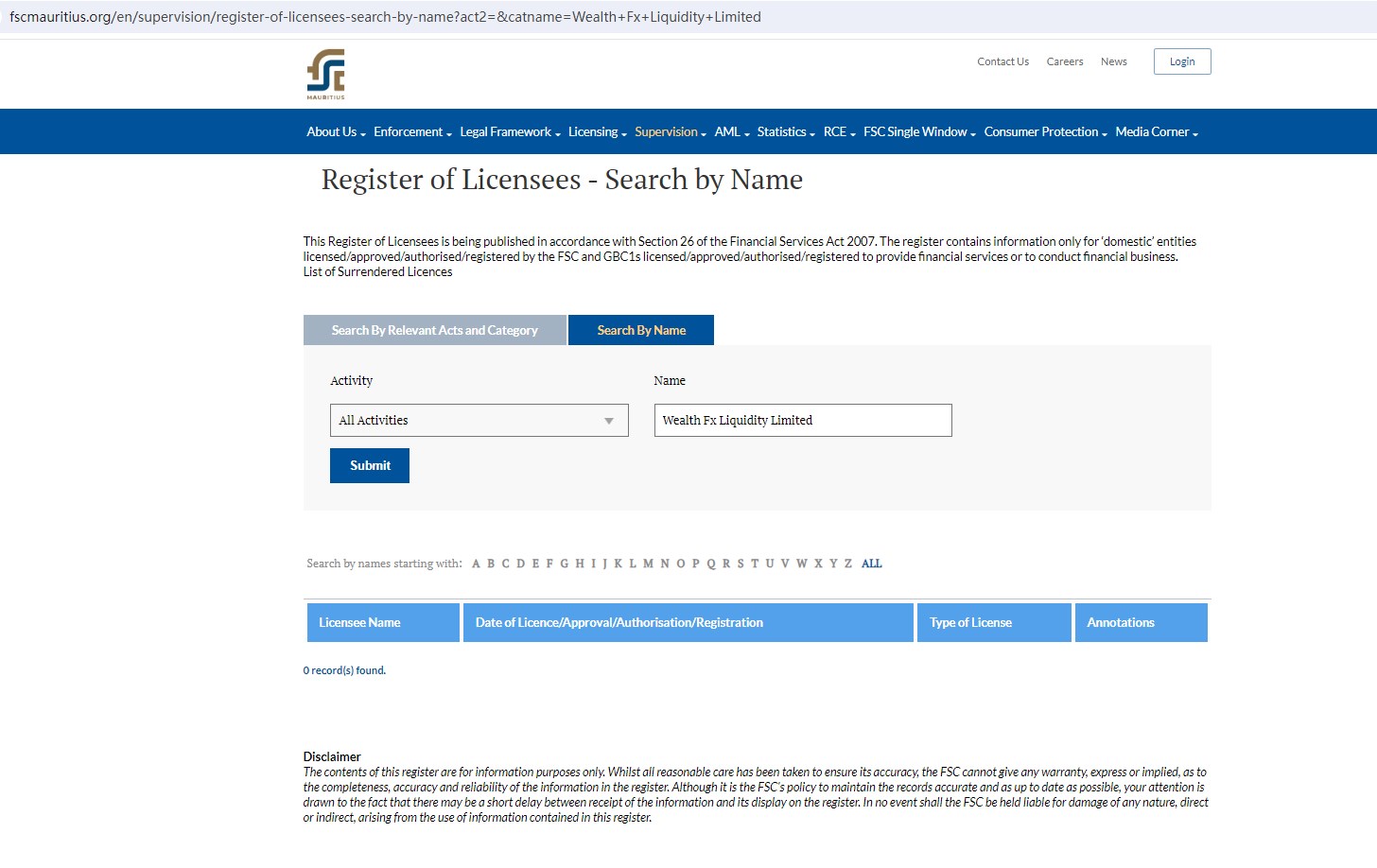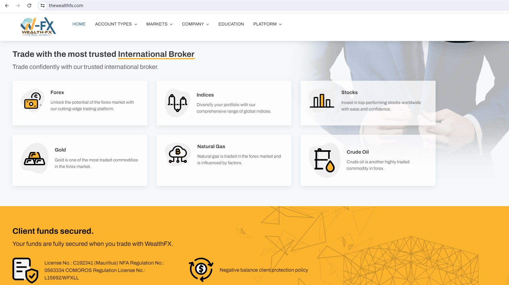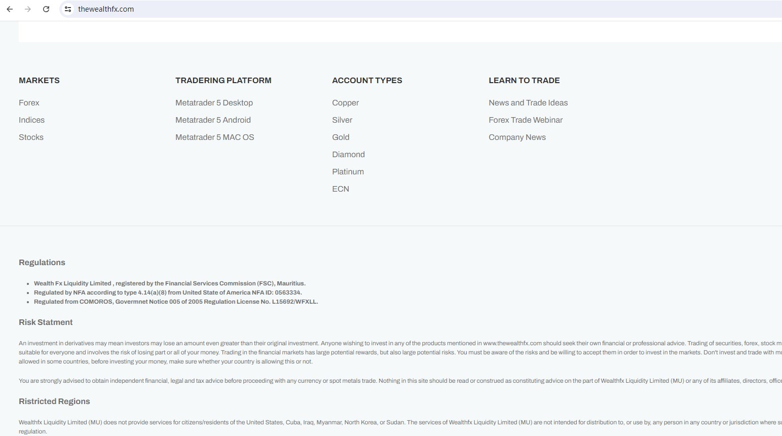 WealthFX claims to be owned and operated by Wealth Fx Liquidity Limited, is a broker regulated by the Financial Services Commission (FSC) of Mauritius, the U.S. National Futures Association (NFA) with the license number 0563334 and Comoros, offering a range of investment products to traders, including Forex, Indices, Stocks and more instruments in global markets.