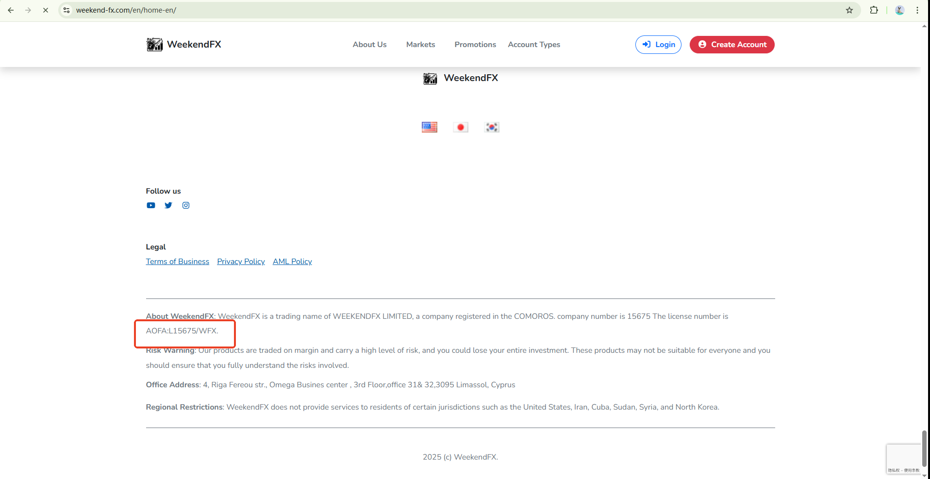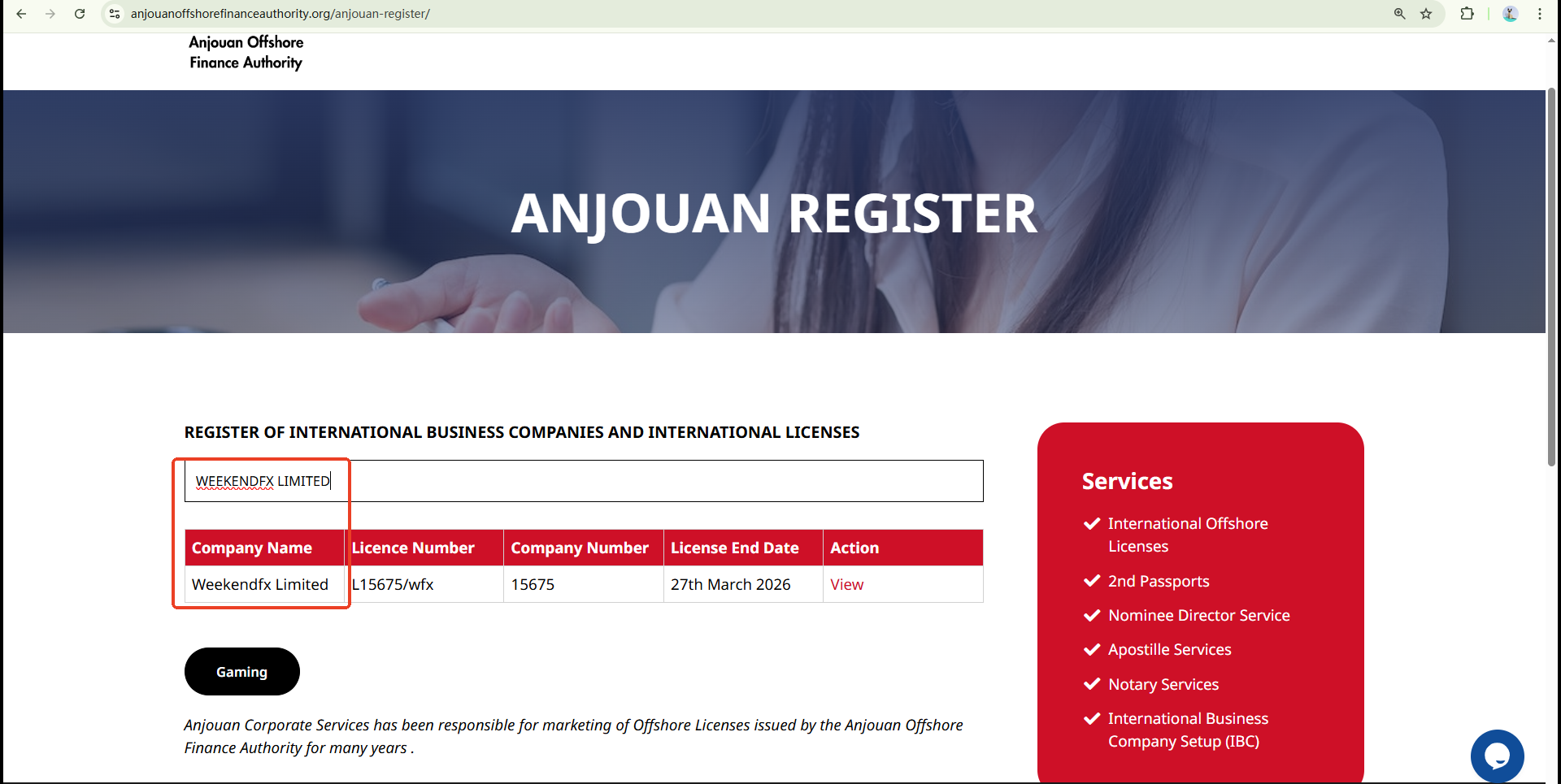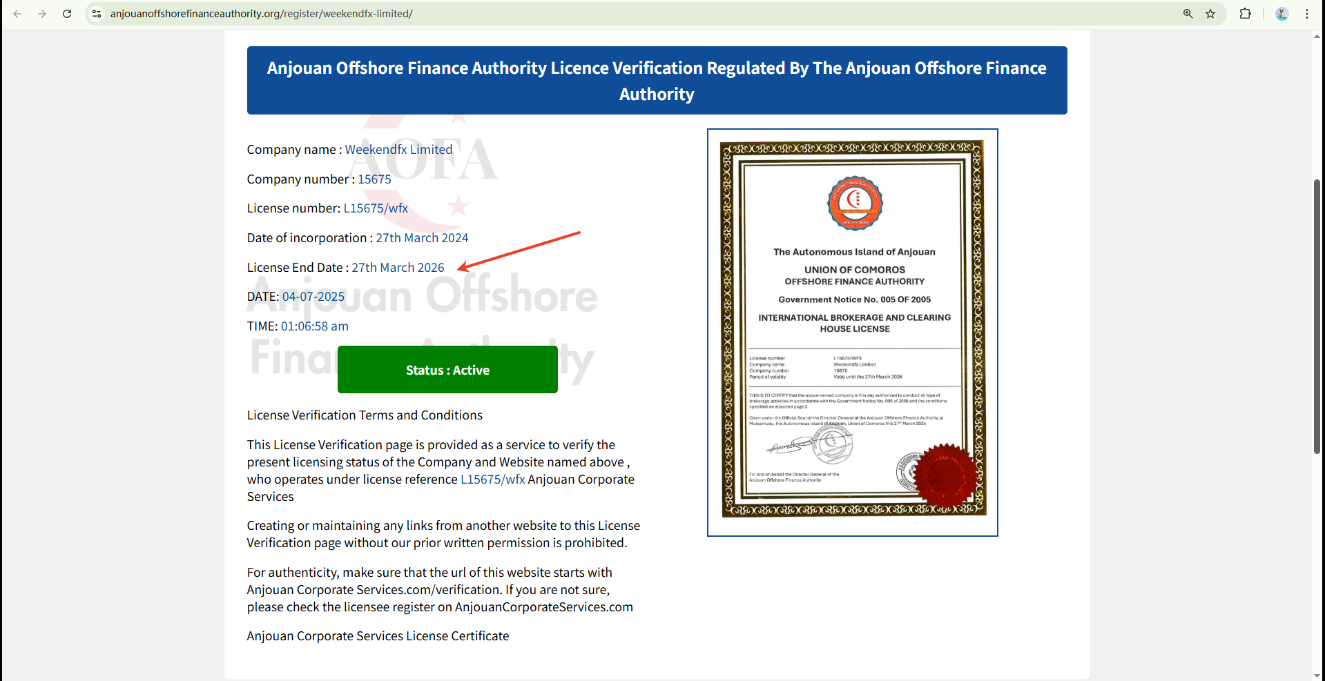 WeekendFX claims to be a trading name of WEEKENDFX LIMITED, which is regulated and licensed by the Anjouan Offshore Finance Authority (AOFA), under licence number AOFA:L15675/WFX. According to our research, a company with the same name is listed in the AOFA database. However, AOFA does not publicly disclose the domain names of licensees, which poses a potential risk of identity theft.