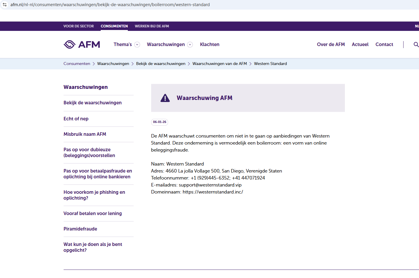 On Jan 6, 2026, the Autoriteit Financiële Markten (AFM) issued a warning regarding Western Standard, suspecting that this company may be offering financial services or products without the necessary authorization. https://www.afm.nl/nl-nl/consumenten/waarschuwingen/bekijk-de-waarschuwingen/boilerroom/western-standard