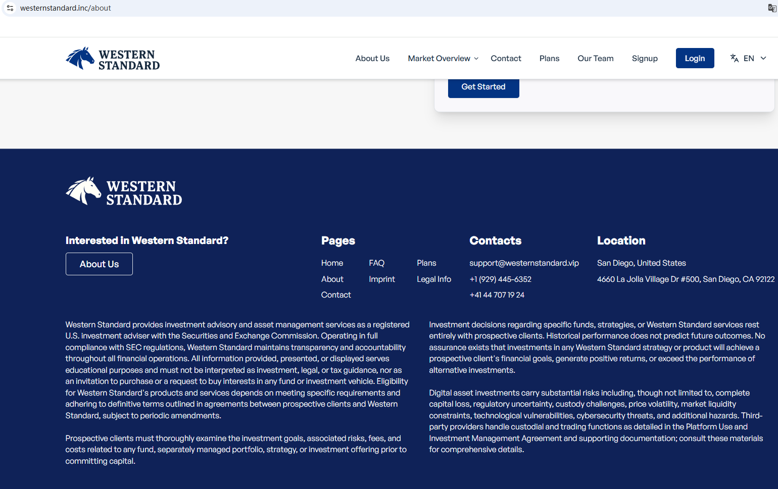 According to its website, it is located in the U.S. Upon investigation, no matching information was found in the National Futures Association (NFA). It also mentions registration with the U.S. Securities and Exchange Commission (SEC). It is well known that the SEC does not have the authority to regulate foreign exchange. In addition, the Autoriteit Financiële Markten (AFM) issued a warning regarding Western Standard, suspecting that this company may be offering financial services or products without the necessary authorization.