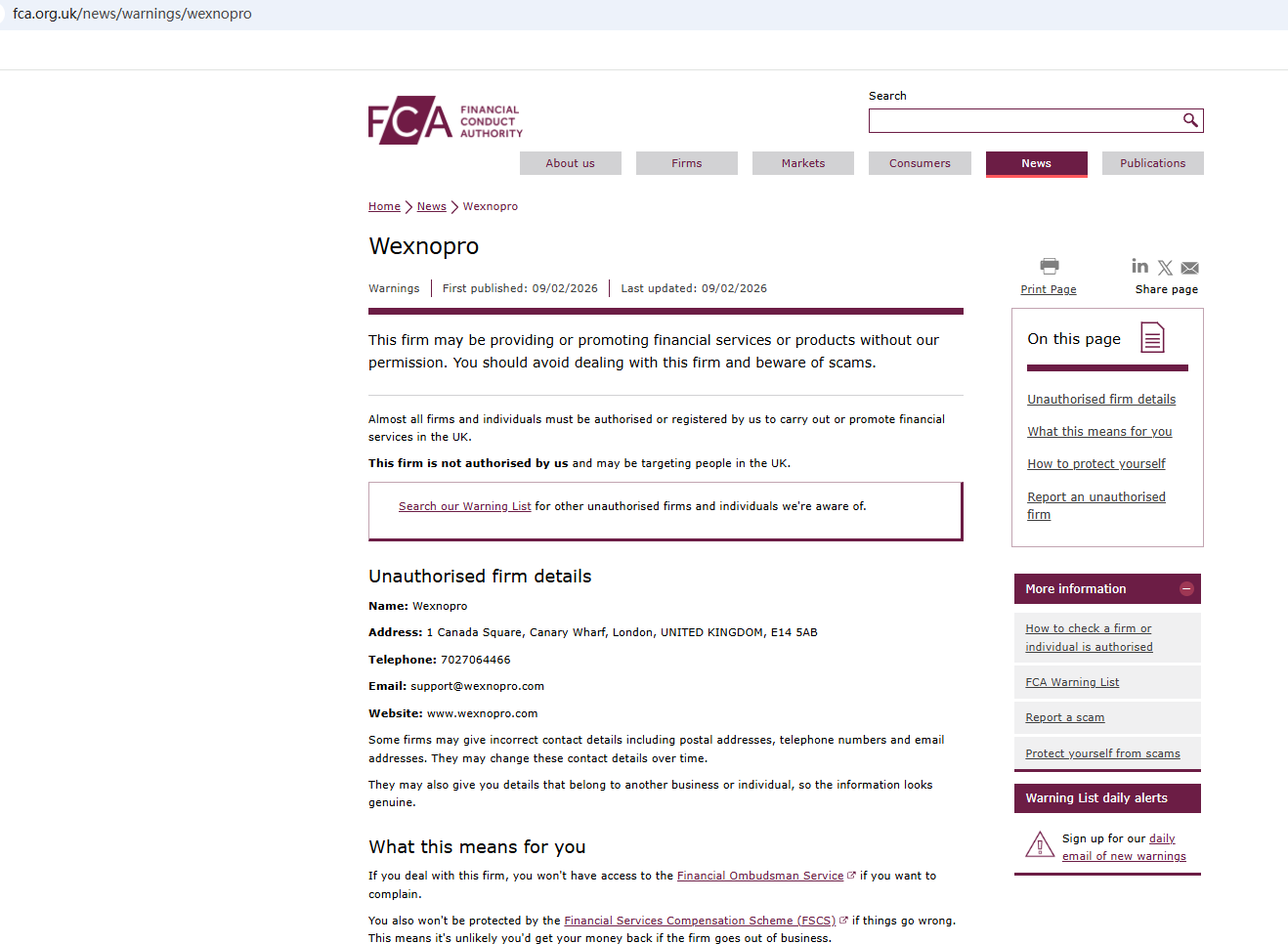 On Feb 9, 2026, the Financial Conduct Authority (FCA) issued a warning regarding Wexnopro, suspecting that this company may be offering financial services or products without the necessary authorization. https://www.fca.org.uk/news/warnings/wexnopro