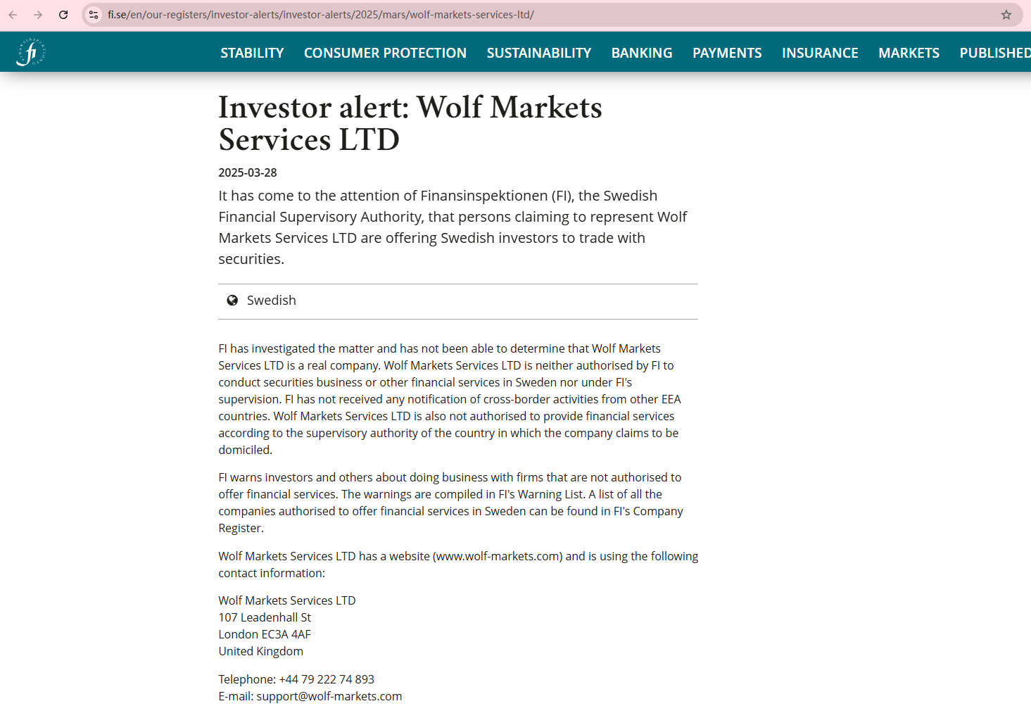 Wolf Markets doesn't provide any useful information to prove its authenticity and legitimacy. This lack of transparency raises significant concerns. The Finansinspektionen (FI) has issued a warning about the broker, noting that they suspect that this is not a real firm. The authority has verified that Wolf Markets is not authorized within the EEA as well as the country where it claims to be domiciled.