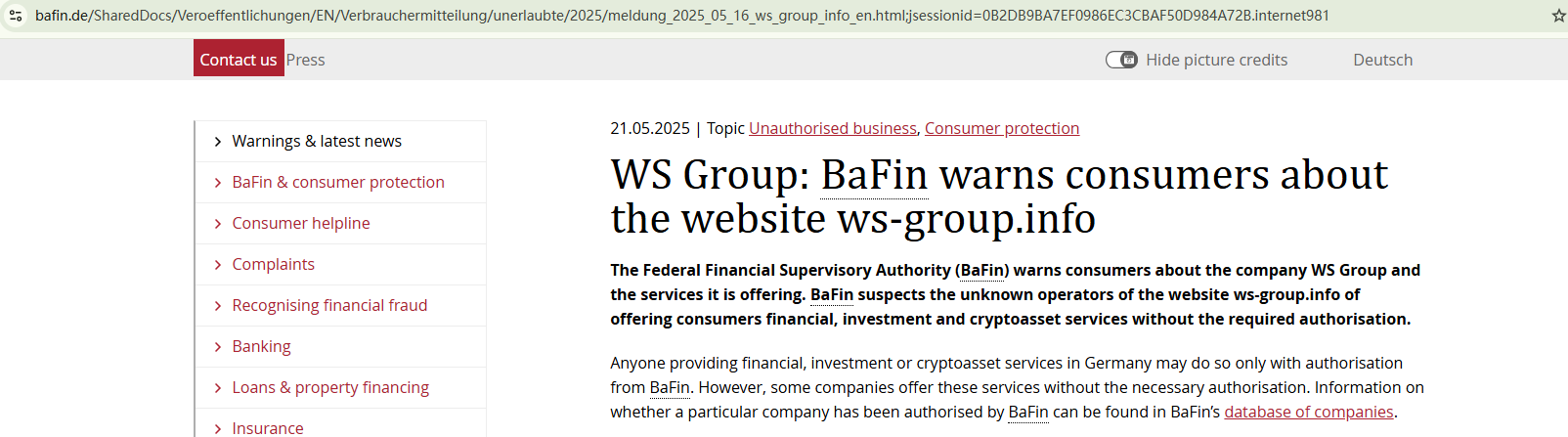The website WS Group is only about one month old, whose domain name was just registered in late April 2025. We looked into this website but haven't found any valid information to suggest that it is properly registered or authorized. What's more, the Federal Financial Supervisory Authority (BaFin) issued a warning against WS Group for the lack of the required authorization.