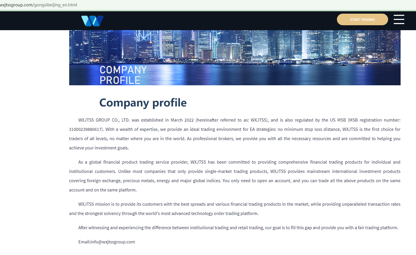 WXJTSS marks itself as a reliable forex broker. It claims to be operated by WXJTSS GROUP CO., LTD, a company allegedly in the UK, with an MSB number 31000239880617 issued by the US Financial Crimes Enforcement Network (FinCEN).