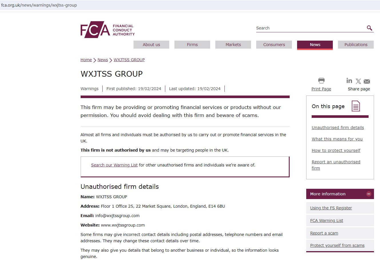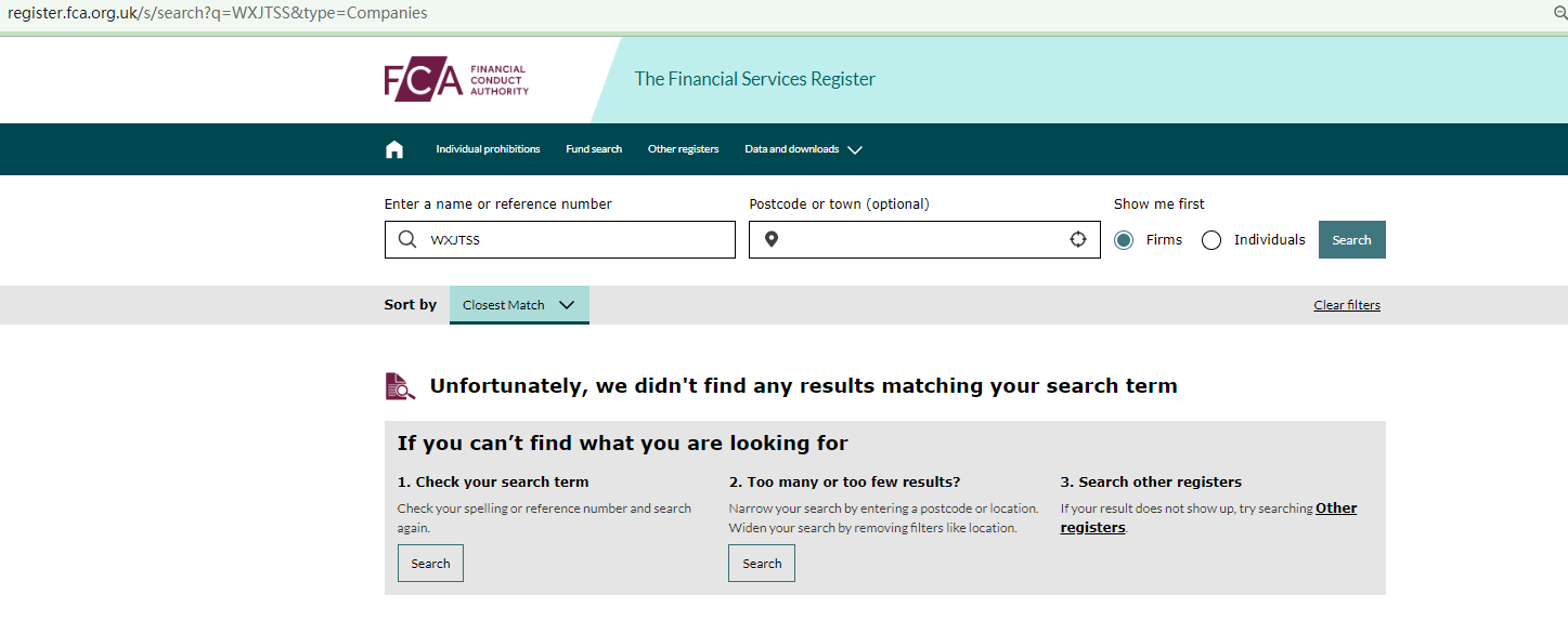 Since WXJTSS purports to be located in the UK, it is required to seek authorization from the Financial Conduct Authority (FCA) before soliciting investors. However, our search for this company didn't return any records. This means it is not authorized to offer financial services or products in this jurisdiction.