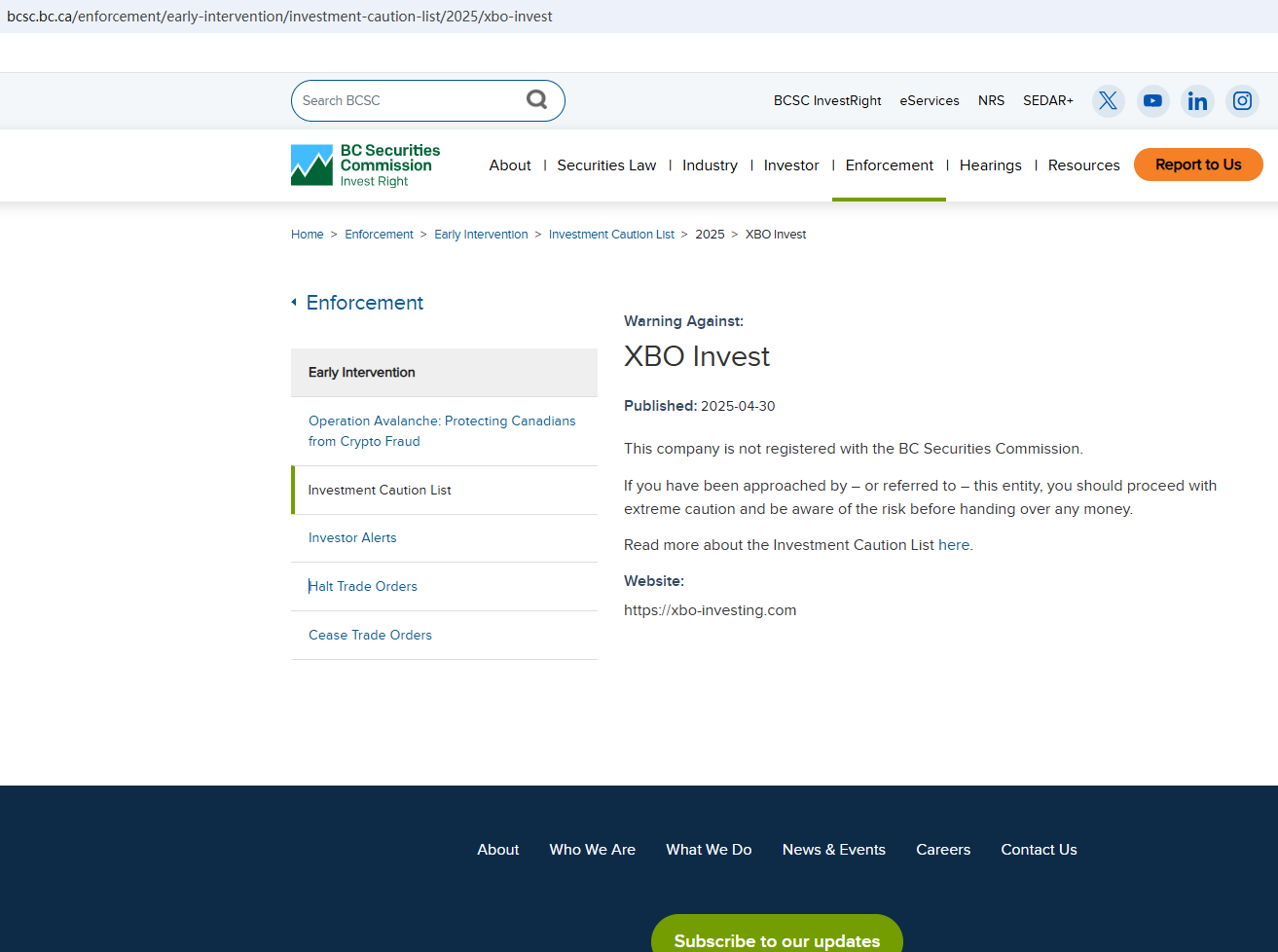 On April 30, 2025 the British Columbia Securities Commission (BCSC) issued a warning that XBO Invest was providing financial services or products without authorisation. You may visit: https://www.bcsc.bc.ca/enforcement/early-intervention/investment-caution-list/2025/xbo-invest