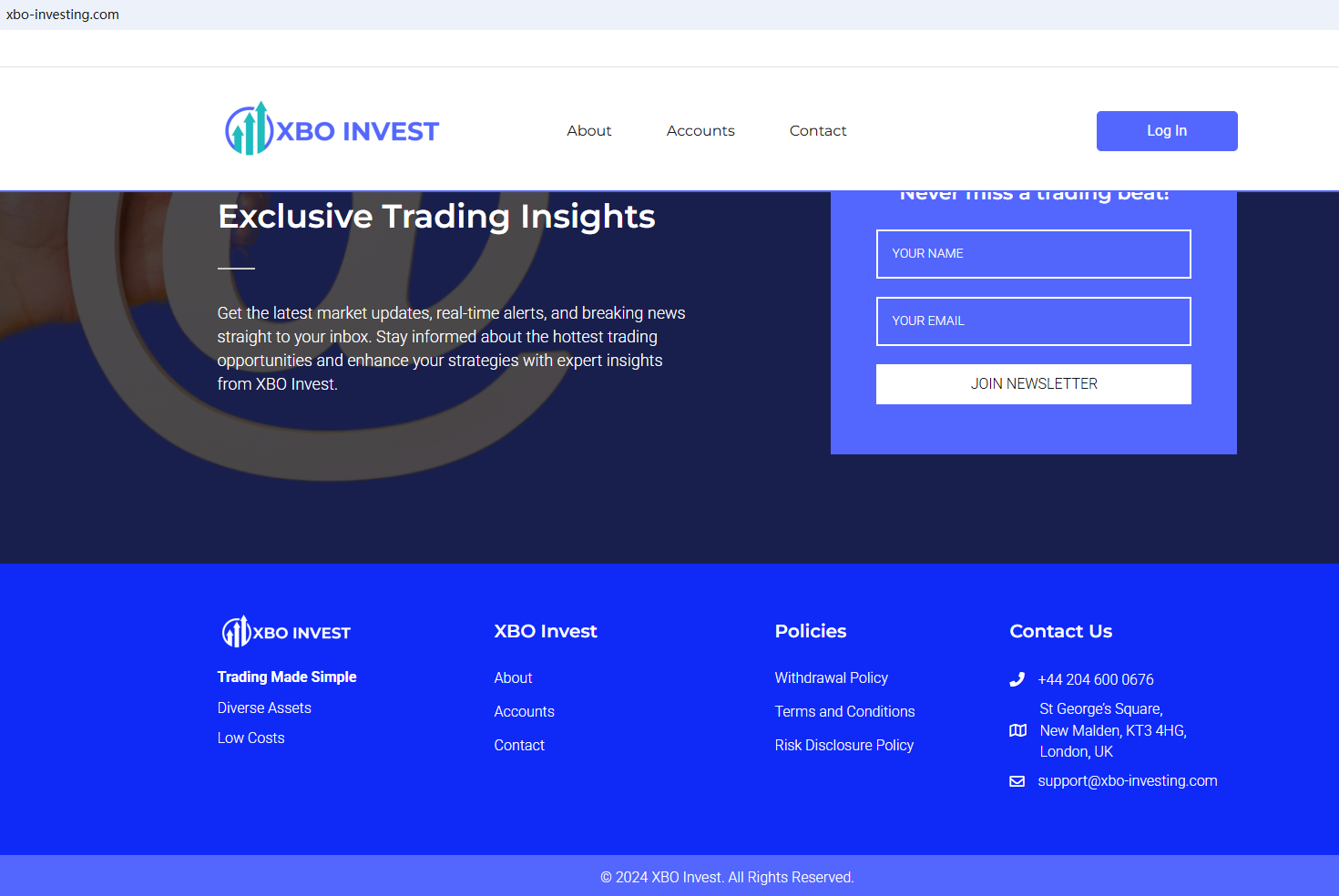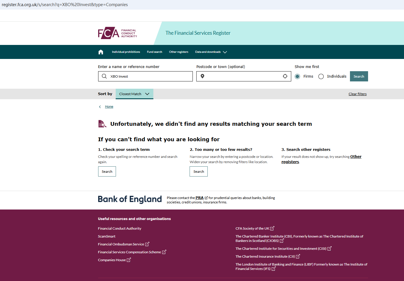 According to its website, it is located in the UK. Upon investigation, no matching information was found in the Financial Conduct Authority (FCA). In addition, the British Columbia Securities Commission (BCSC) issued a warning that XBO Invest was providing financial services or products without authorisation. In essence, XBO Invest is not regulated by any governing body. Entrusting it with investors' funds is highly risky, as there are no legal protections in place to safeguard the funds. XBO Invest appears to be a scam.