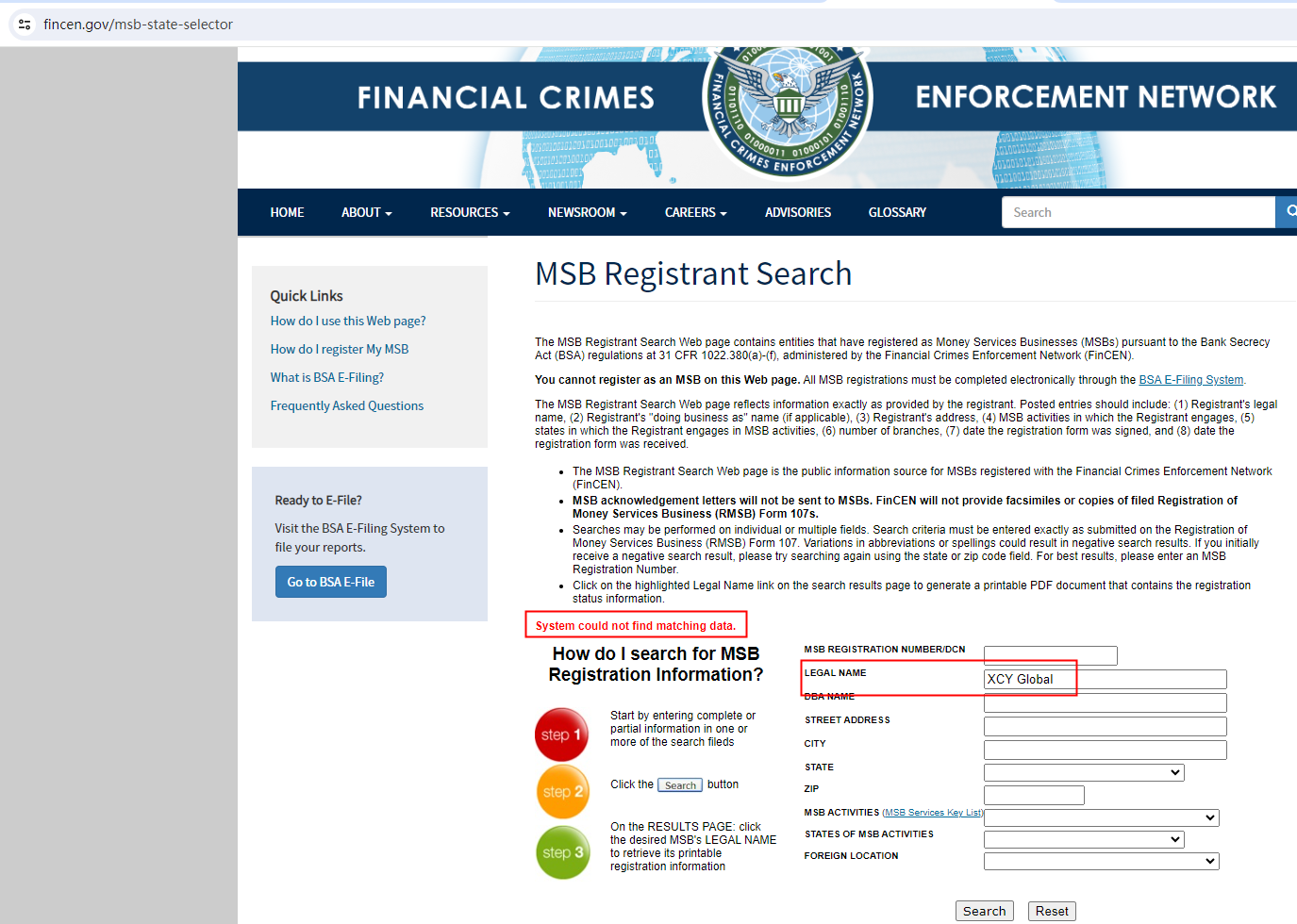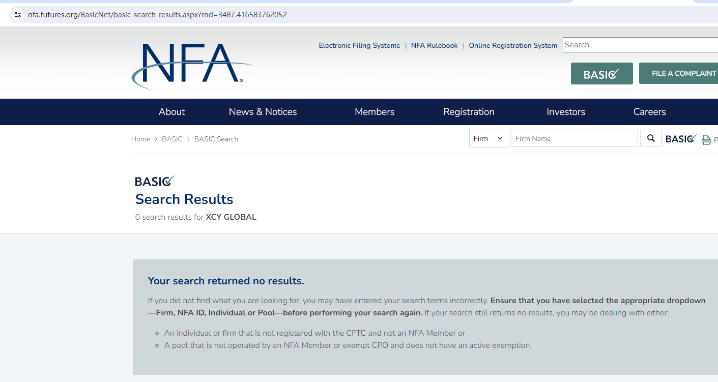 Like its deceptive counterparts, XCY Global LTD claims to be registered with the Financial Crimes Enforcement Network (FINCEN) and the National Futures Association (NFA). However, the reality contradicts these claims: there are no records in the FINCEN and NFA registers. These findings provide adequate reasons for investors to steer clear of XCY Global LTD, a fraudster operating beyond the regulatory framework.