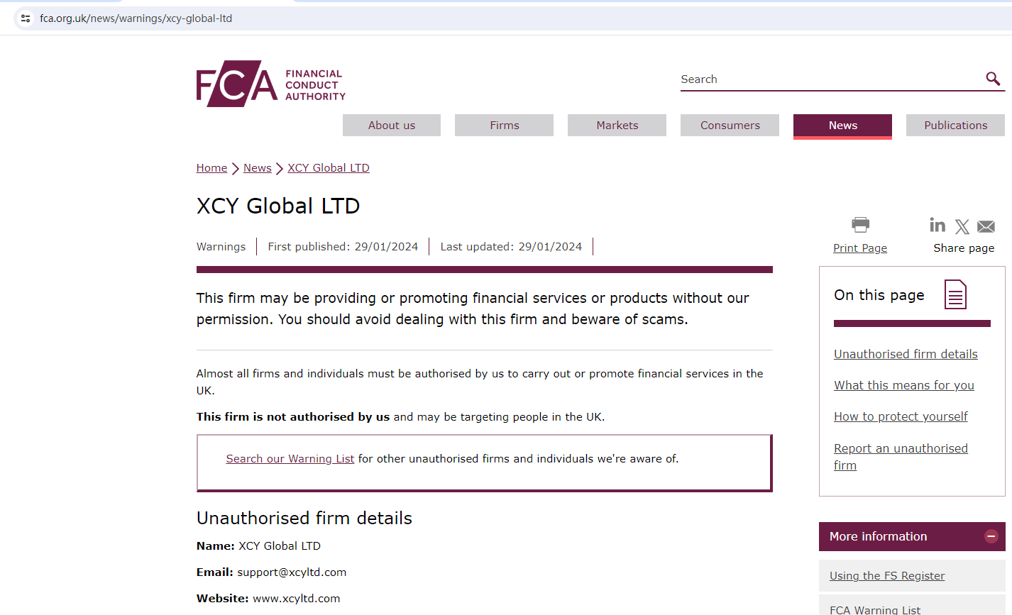On 29 January 2024, the United Kingdom Financial Conduct Authority (UK FCA) issued a warning that XCY Global LTD was providing financial services or products in the UK without authorisation. You may visit: https://www.fca.org.uk/news/warnings/xcy-global-ltd