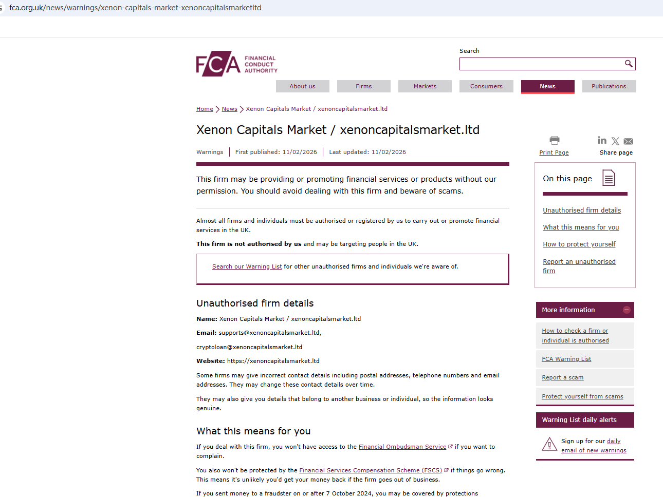 On Feb 11, 2026, the Financial Conduct Authority (FCA) issued a warning regarding Xenon Capitals, suspecting that this company may be offering financial services or products without the necessary authorization. https://www.fca.org.uk/news/warnings/xenon-capitals-market-xenoncapitalsmarketltd
