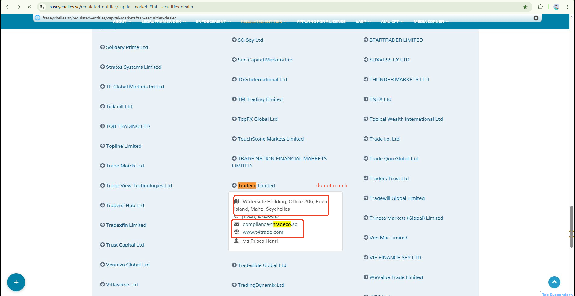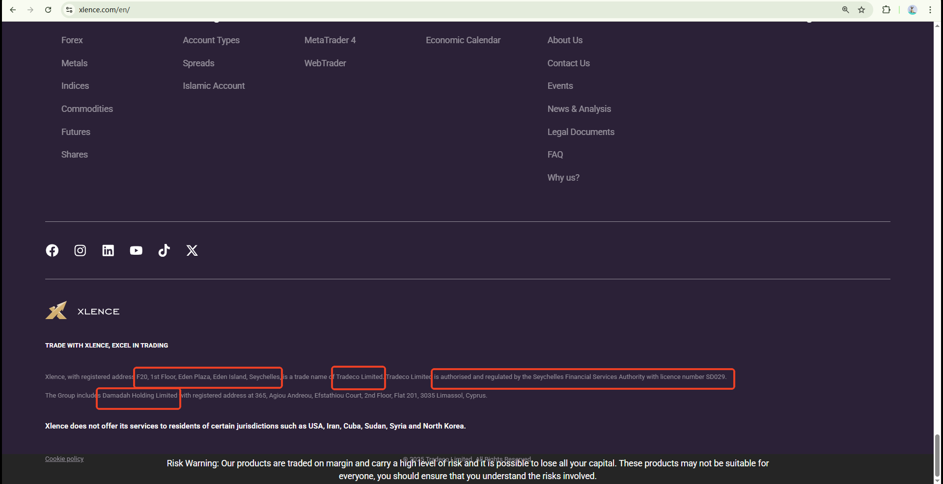 According to their claims, Xlence is registered in the Seychelles and is a trading name of Tradeco Limited, which is authorised and regulated by the Seychelles Financial Services Authority (FSA) under licence number SD029. While we did find a matching Tradeco Limited name on the FSA website, the recorded company address and domain name do not match the information provided by Xlence. This indicates a potential risk of identity theft.