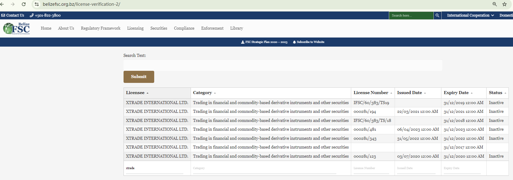 Xtrade claims to hold a license from the Belize Financial Services Commission (Belize FSC). However, our verification with the authority suggests that all potential licenses associated with the broker have been canceled.