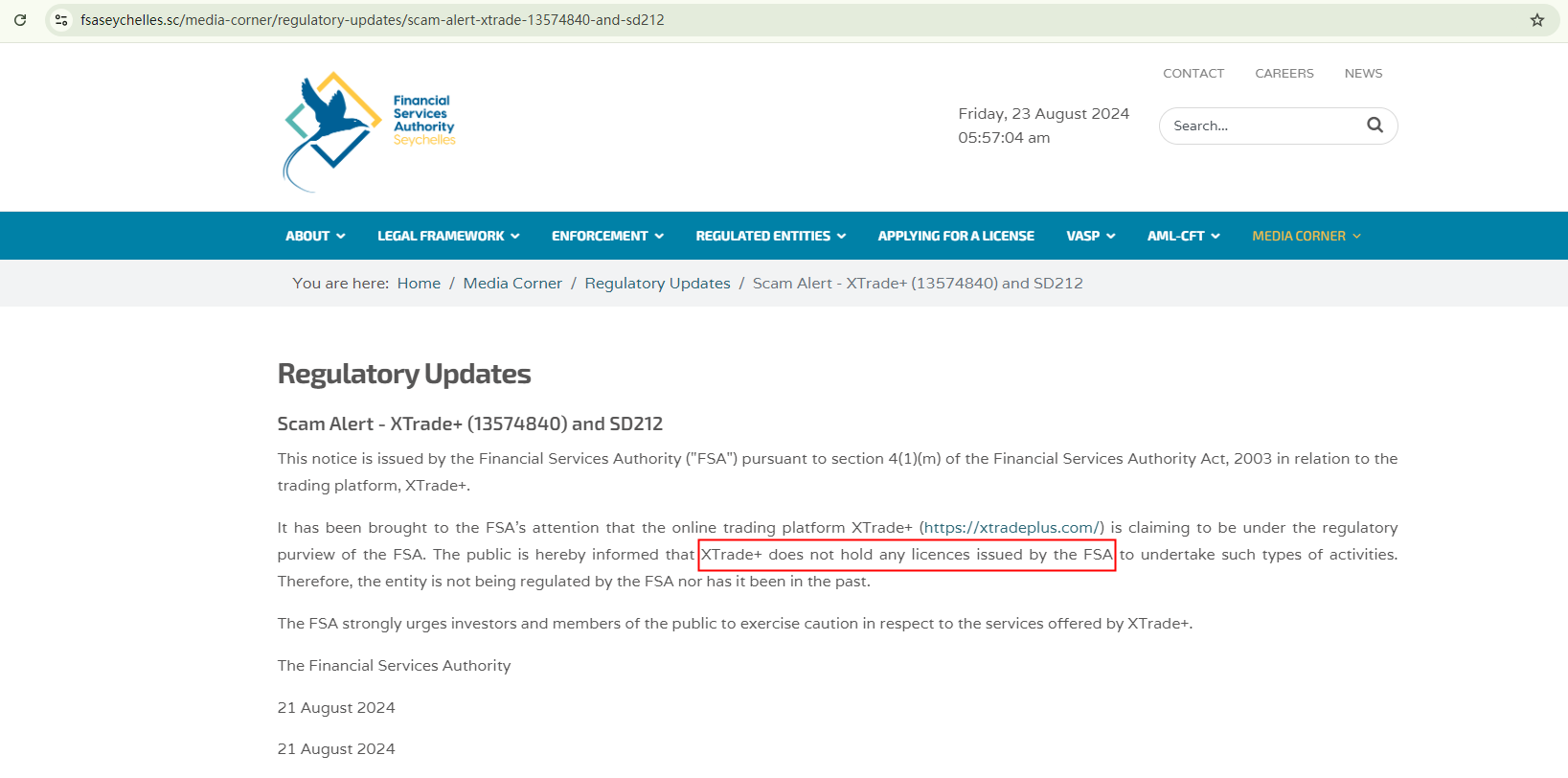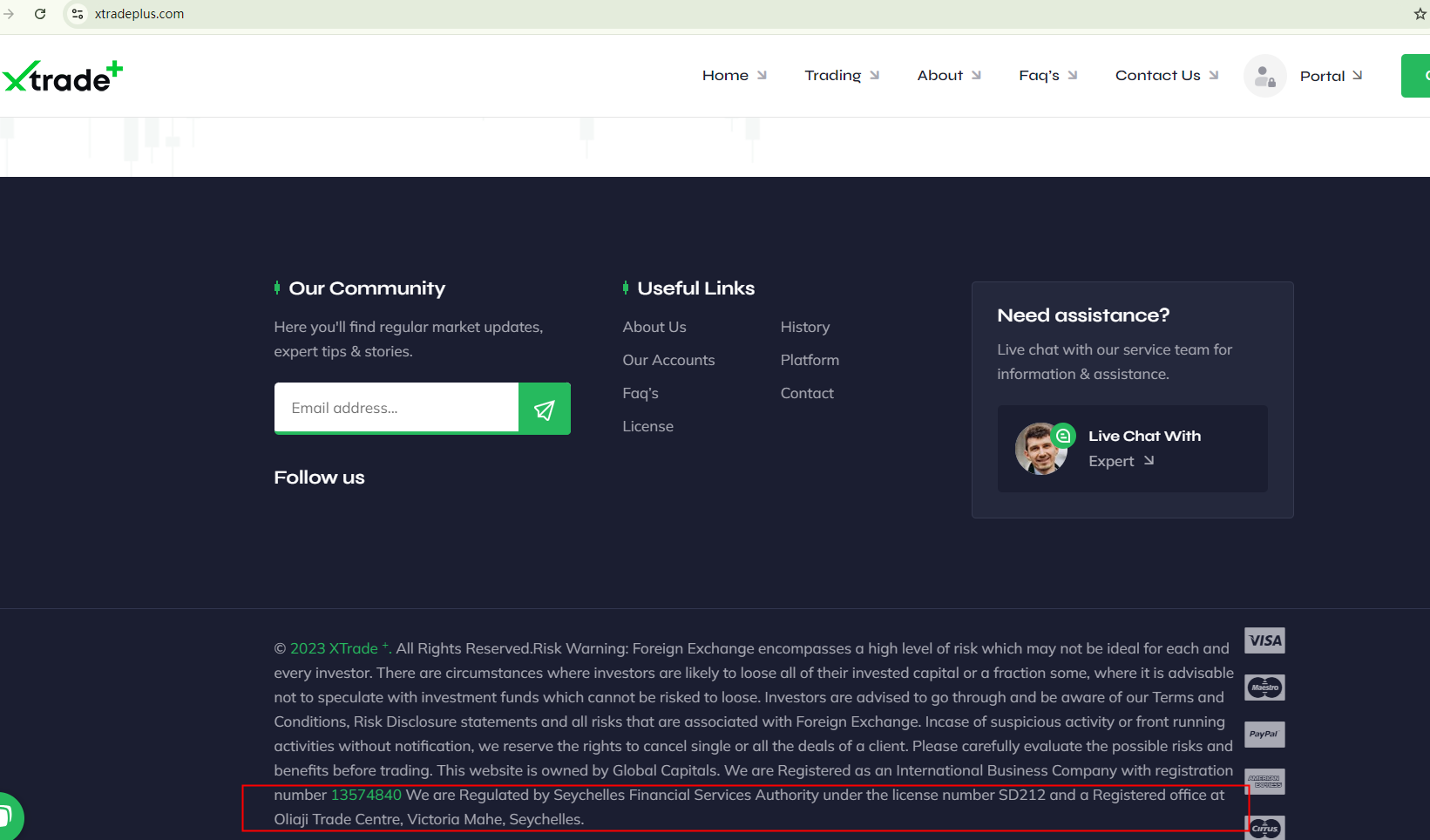 In the website footer, XTrade Plus claims to be authorized by the Seychelles Financial Services Authority (Seychelles FSA). However, the Seychelles FSA has issued a warning, stating that this claim is false and that XTrade Plus is neither authorized nor regulated by them.