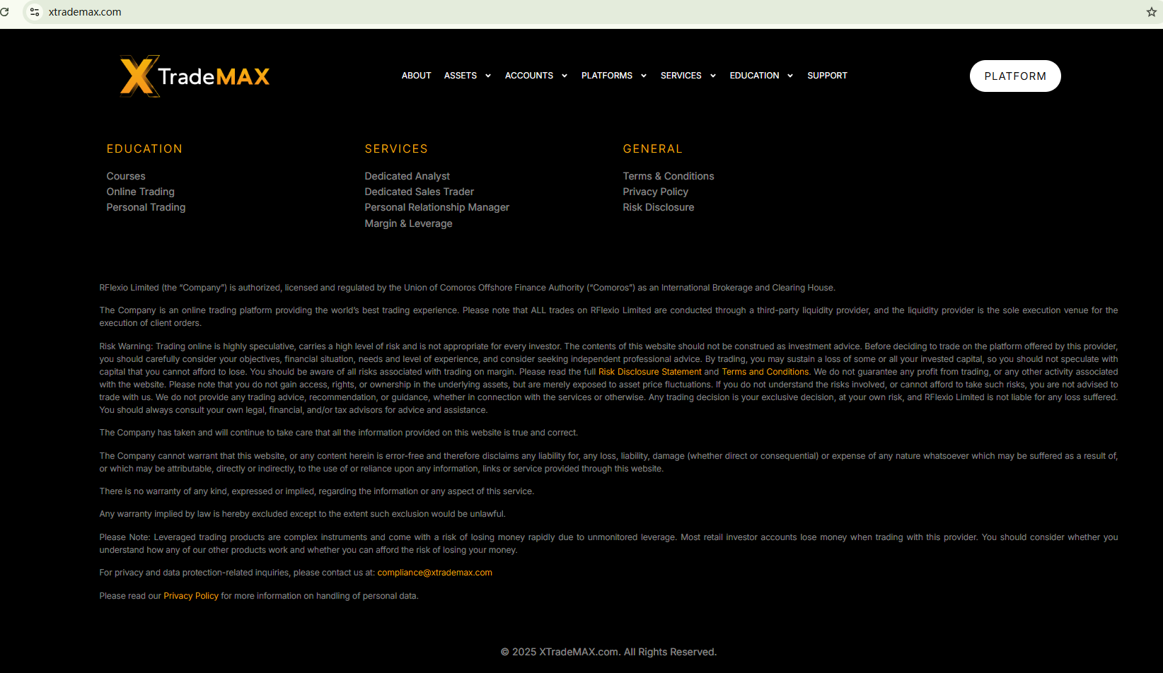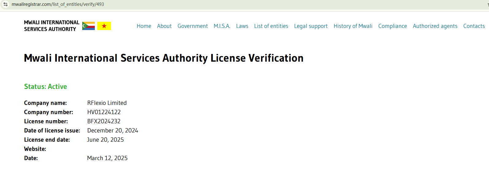 XTradeMAX claims to be affiliated with a company, RFlexio Limited, which is allegedly registered in Comoros. However, our verification with the Mwali International Services Authority (MISA) hasn't found information supporting the claimed affiliation. It appears that the purported connection merely exists within the website of XTradeMAX. The Financial Conduct Authority (FCA) has issued a warning against XTradeMAX for the lack of the required authorization.